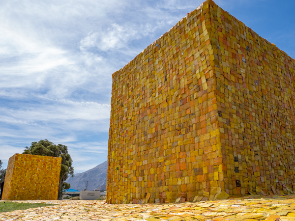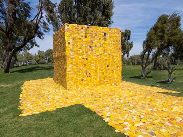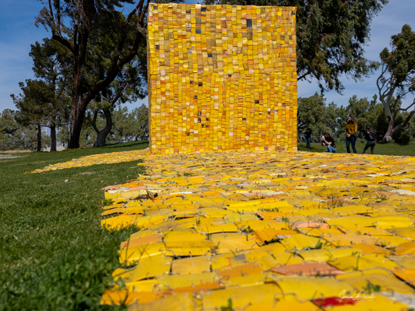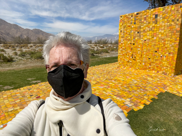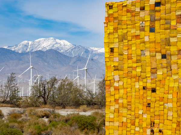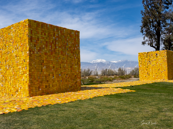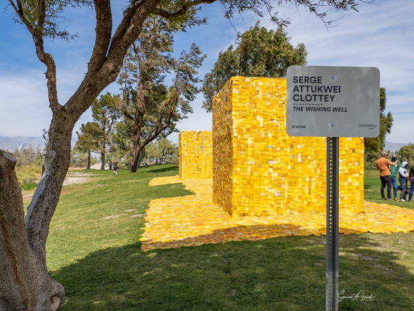 Then it was back on the road heading towards Palm Springs proper. The next installation, the Wishing Wells, was one of my favorites. It was two very large cubes, connected by a walkway, all made of plastic yellow Kufuour gallon water jugs, woven together. The Kufuor are used to transport water in Ghana. Turns out they are no longer used and now pollute the streets and the waterways. Yet this installation was a reminder of the importance of water and how so many communities around the world have to trek long distances to get their water. This jus helped them carry their precious water back to their villages. Seeing these “wells” in the middle of the desert reminded me that needing to find water is a universal problem.