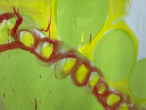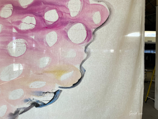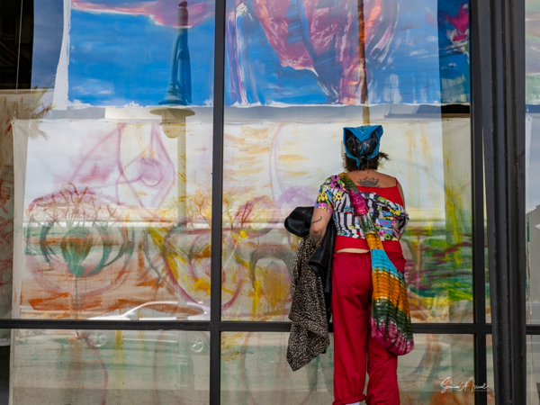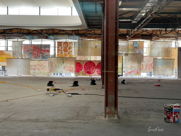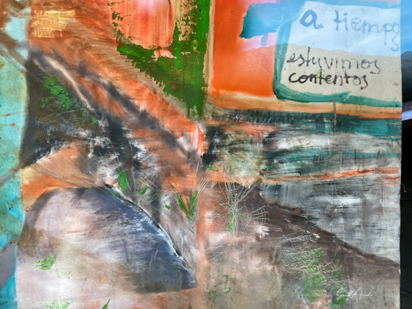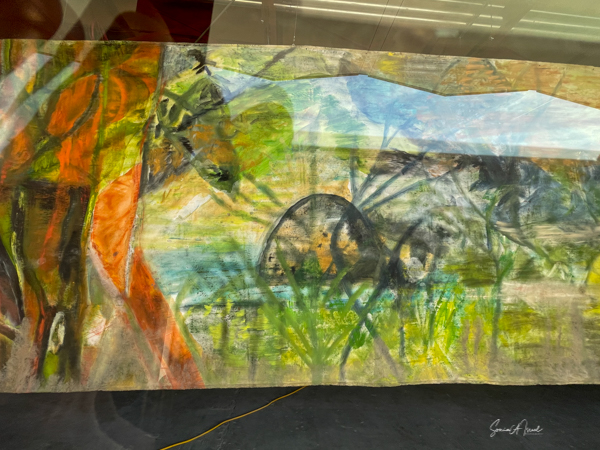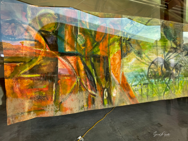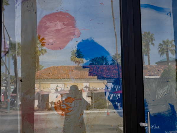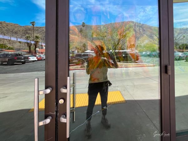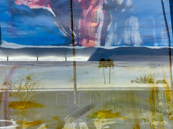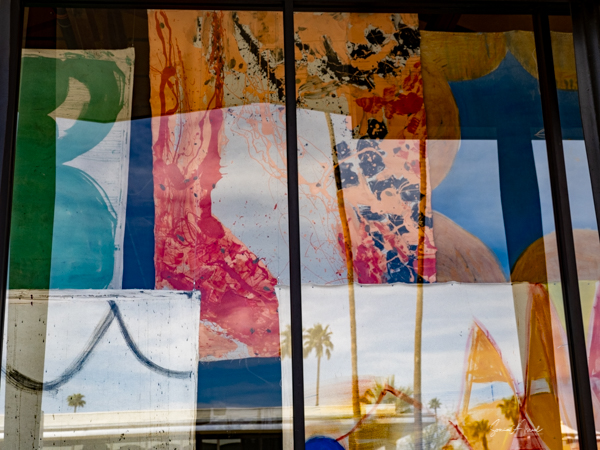 This one was very different than all the others because it was inside a building that was locked. We had to look at the large-scale abstract paintings through the window. Turns out that the artist, Vivian Suter from Buenos Aires, Argentina, wanted the reflections of us and the palm trees and mountains, i.e., the desert landscape behind us to become part of her paintings. The colors were very bright and happy and they made me smile. Not a bad thing!