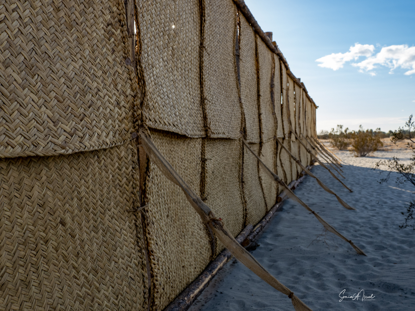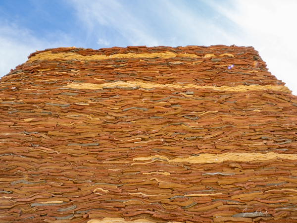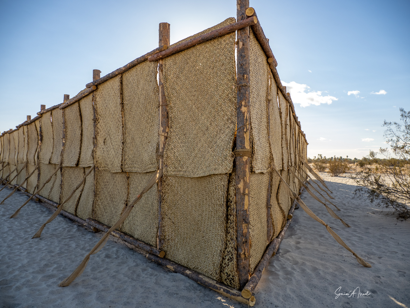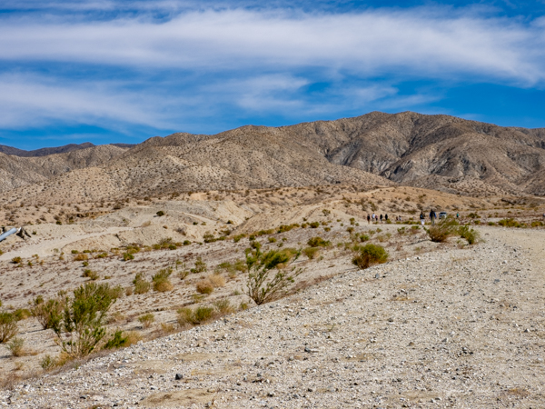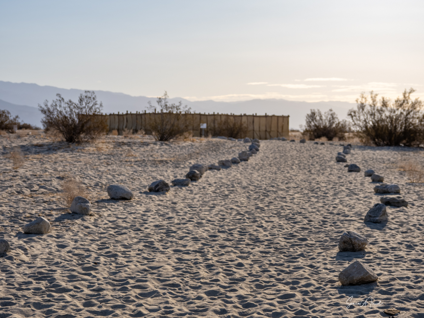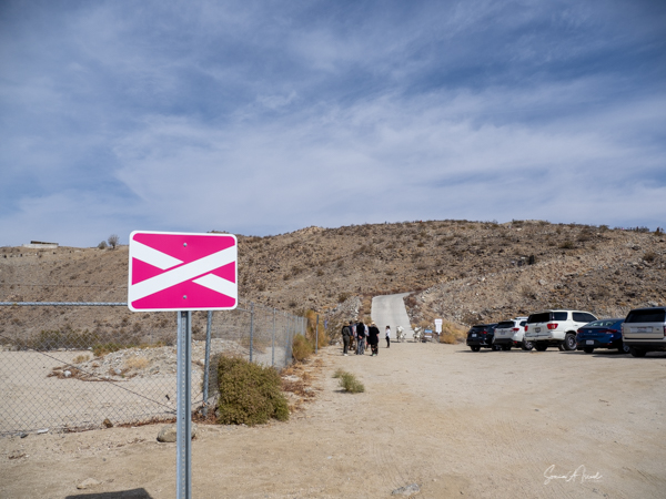 I finally arrived and pulled into the sandy parking lot. Luckily, I was to discover, each site had parking for us. I got out of the car, donned my mask and grabbed my new Olympus Om D E M1 Mark III camera with my Olympus M. Zuiko digital ED 12-100mm f/4 Pro lens, and headed up the desert hill towards what looked like a large wall in the middle of nowhere. It was a ten minute walk, although if I hadn’t stopped to take lots of pictures, it likely would have been faster.