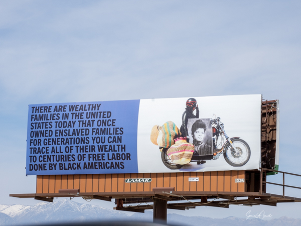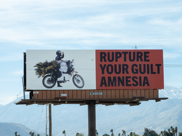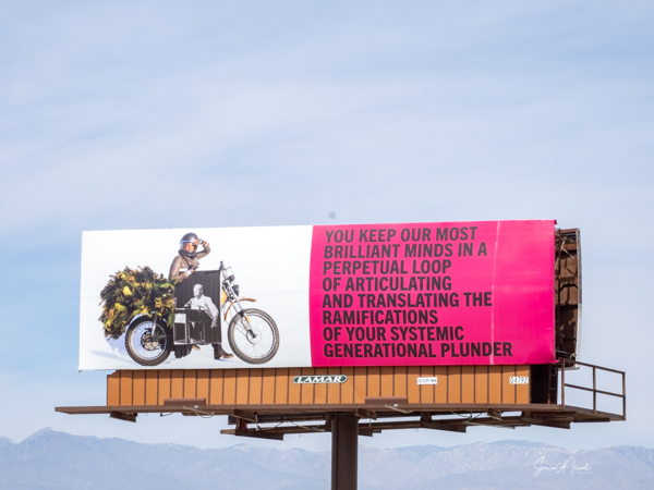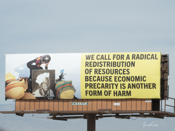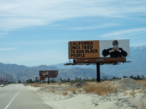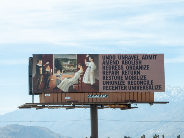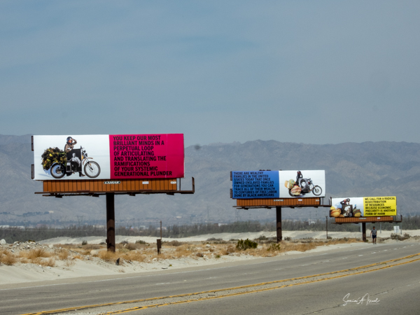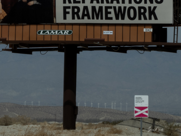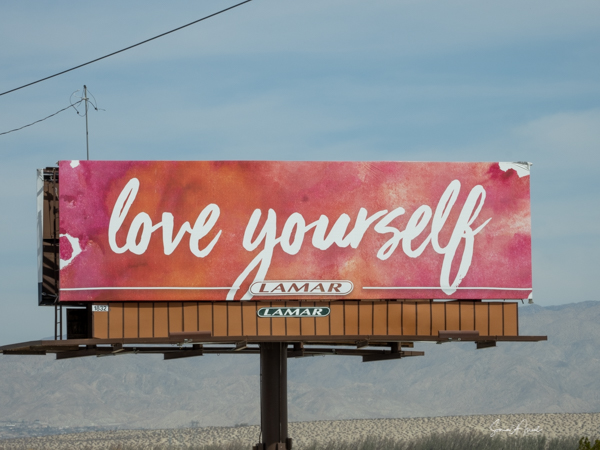 My next stop was an exhibit of double-sided billboards along the Gene Autry Trail, by Xaviera Simmons from New York. She describes her work at an “ongoing investigation…of memory…and present and future histories…” The series of billboards represent “reverence, resistanc and the redistribution of tangible material resources.” The problem with this piece of art is that I had to pull over onto the shoulder of the road in order to see and read the billboards which was not very conducive to enjoying them or more importantly, to taking the time to understand the message. That’s where the pictures come in. Once I got back at the end of the day, I could study them more closely and think about what they represented, the bigotry and racial inequality. By the way, the last sign, Love Yourself, was not part of the exhibit, but I thought it was very pertinent and fitting.