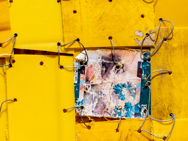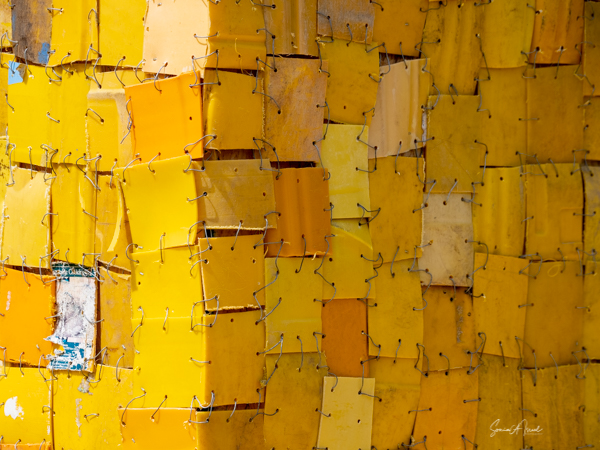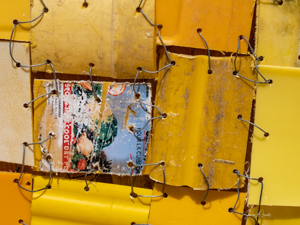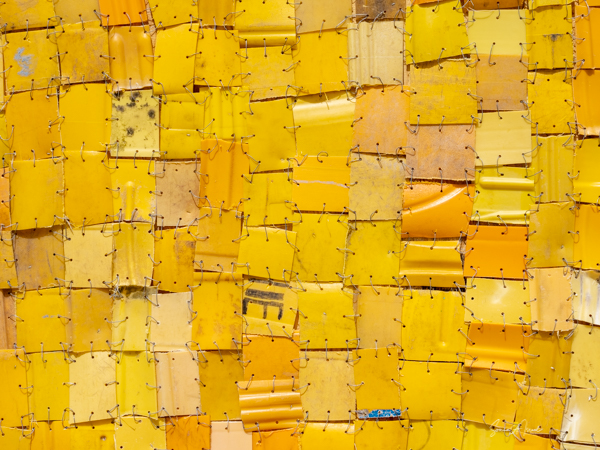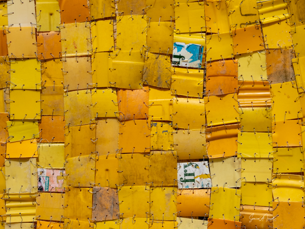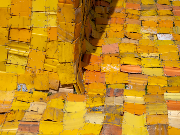 The artist, Serge Attukwei Clottey is of course, from Ghana where he use “yellow plastic jerrycans known as Kufuor gallons…[to] create sculptures …that speak to histories of colonial pillaging and its effects on trade and migration. These gallons function as material and a striking symbol in Attukwei Clottey’s practice: a reminder of the way violent pasts manifest in the everyday.”