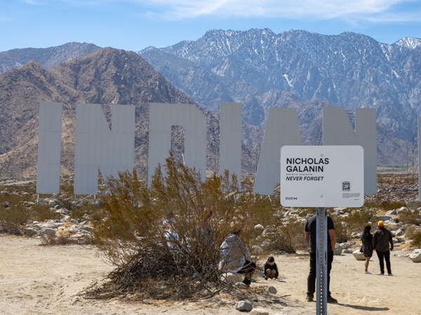 The artist, Nicholas Galanin, is a Tlingit and Unangax̂ from Sitka, Alaska. For him memory and land are totally intertwined. His installing is made up of 45-foot high letters which say, INDIANLAND, reminiscent of the Hollywood sign in LA. That sign initially spelled out HOLLYWOODLAND and was erected to promote a whites-only development. Never Forget is a call to action and reminder that this land belonged to the Indians and, as the artist believes, should be given back to local Indigenous communities.