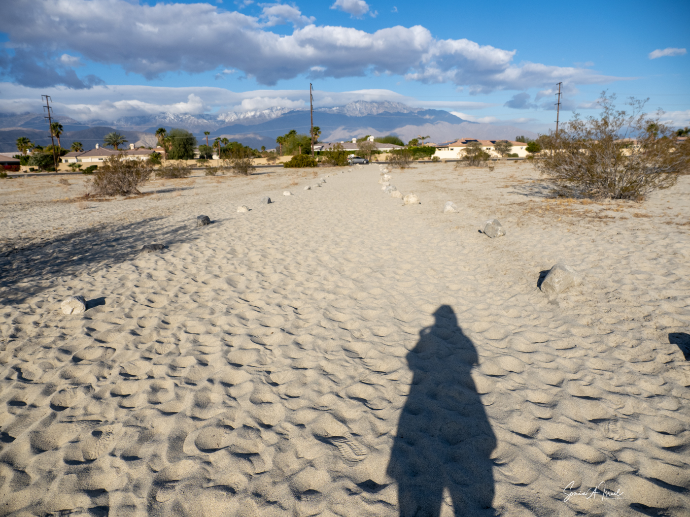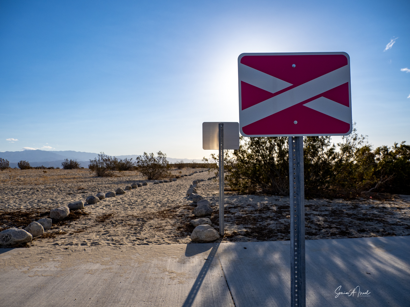 Once parked, I walked on the sand on the path marked by rows of stones. This was real sand as you would find at the beach. Yes, where golf courses have not been built, this is still a desert. I had to raise my feet up high to keep the sand out of my shoes. There was sagebrush everywhere. There was a sign again advising to respect the desert and stay on the path, but the funny thing is that you could only read it on the out!