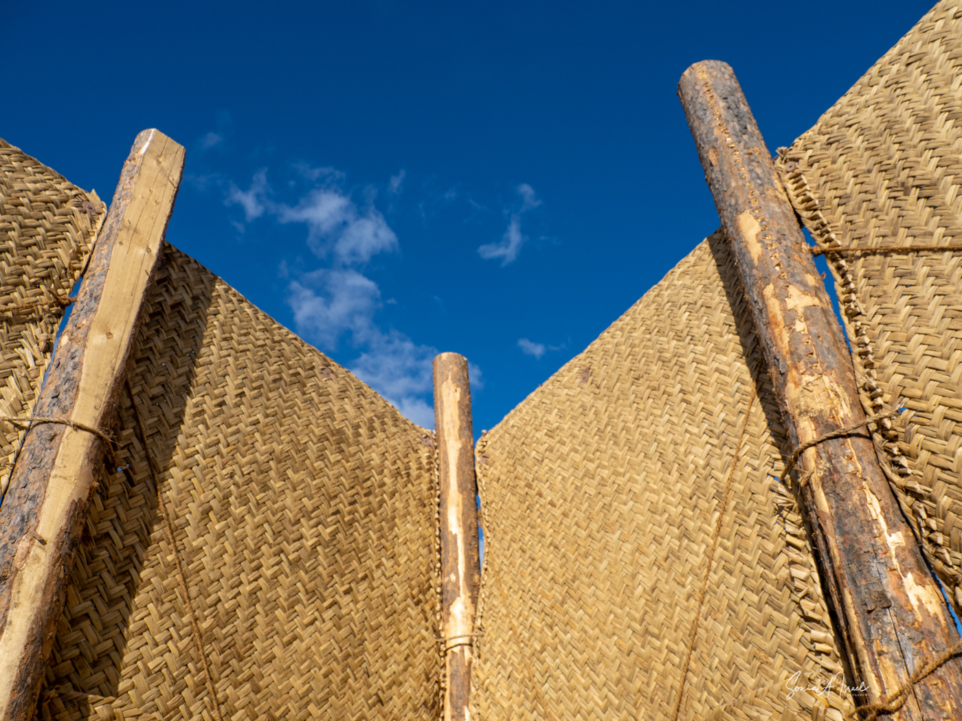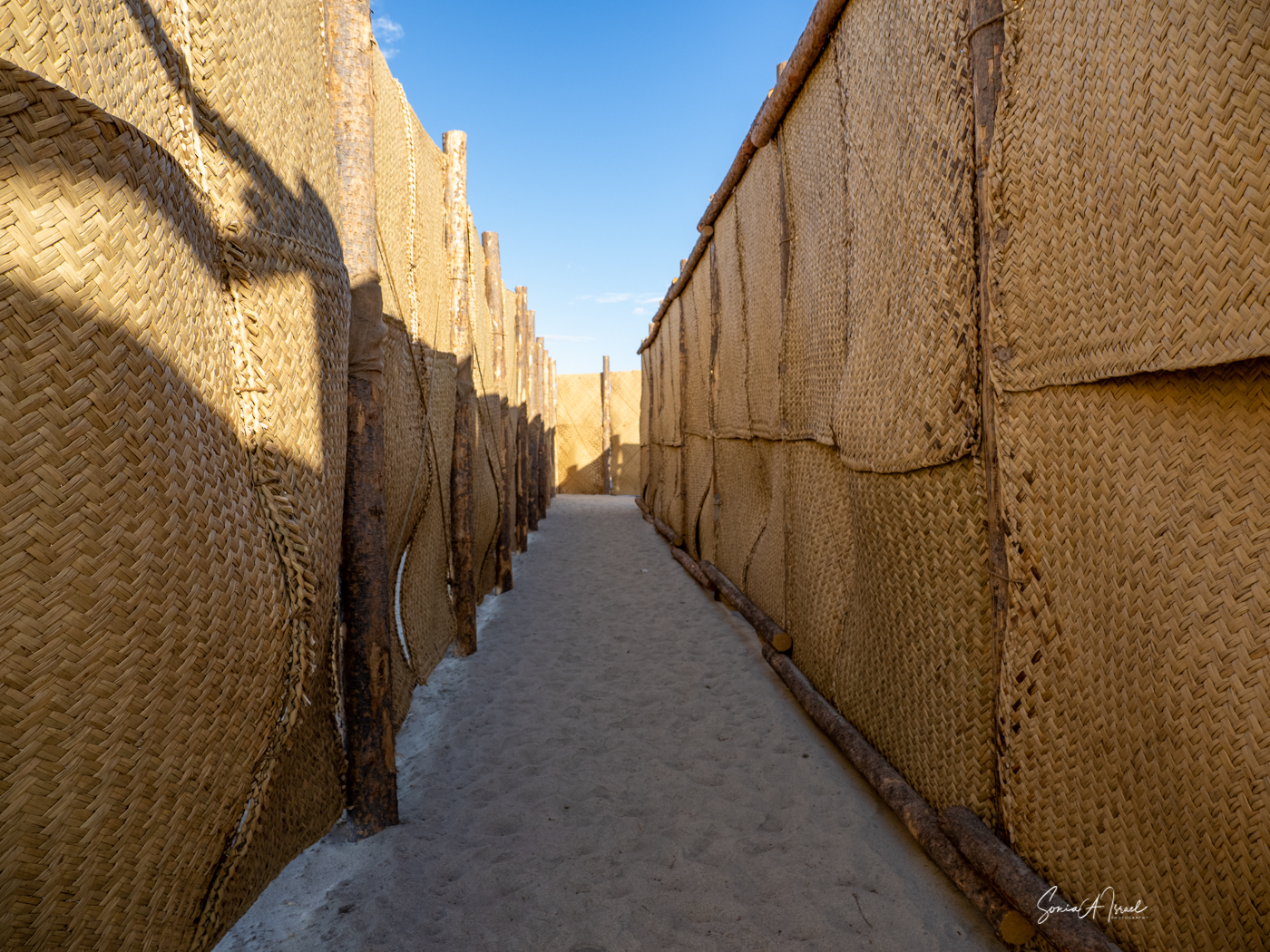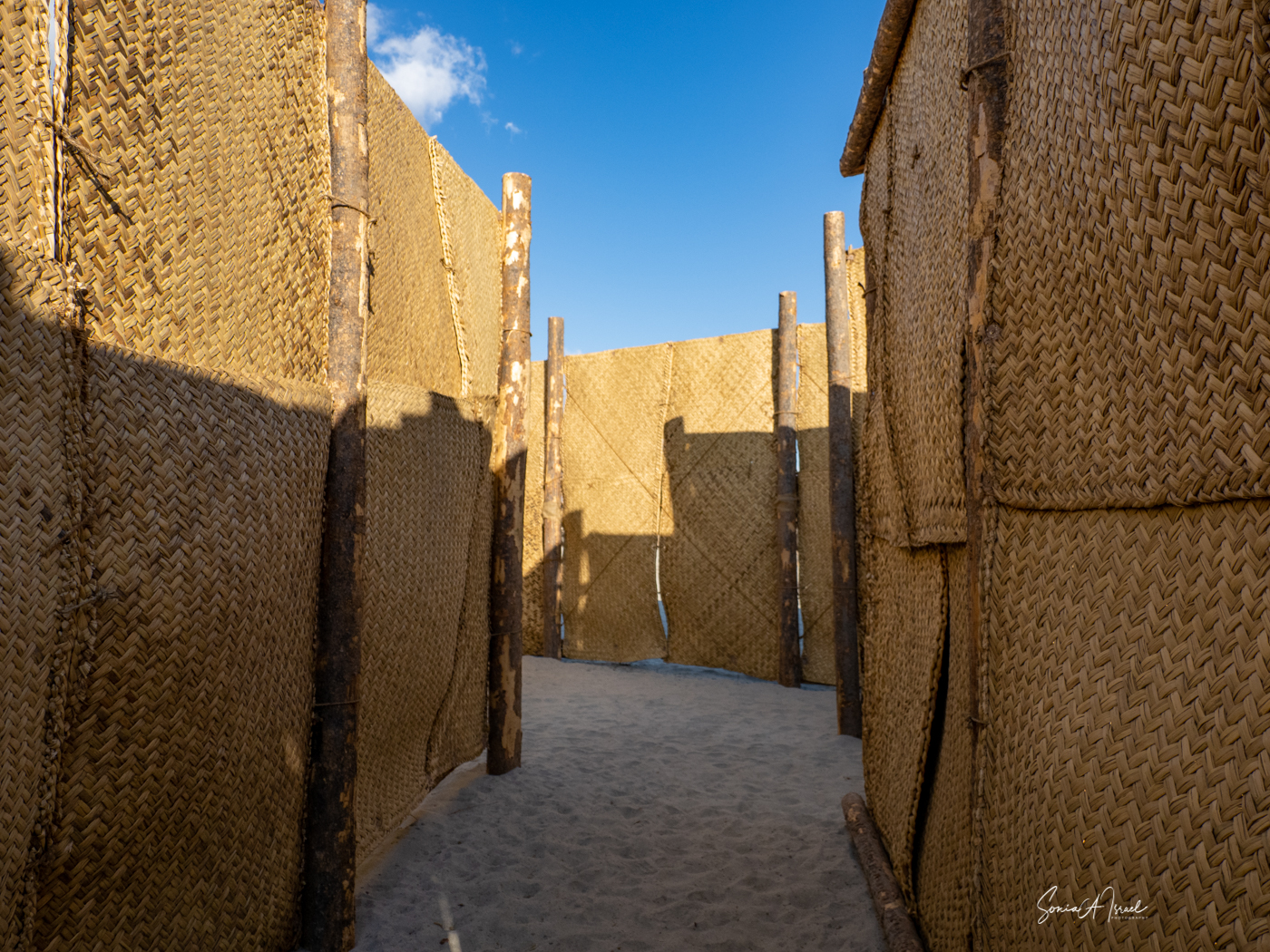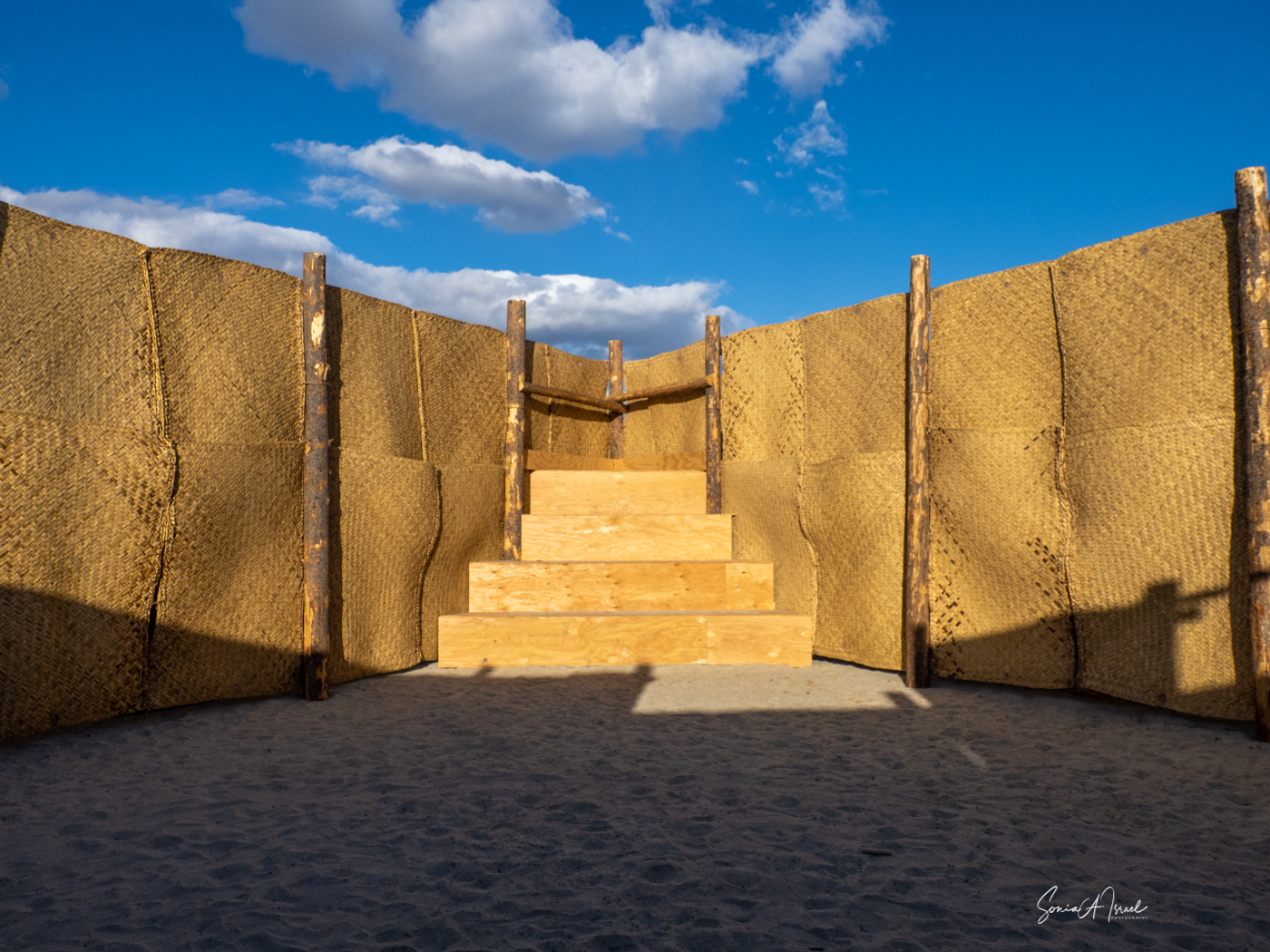 As I went through the maze, I tried to imagine myself on a journey to the unknown. I could smell the straw from the mats and for some reason, I found it soothing. I did not know where each passage would lead. I did not know where I would end up. That is the definition of a journey. Something we have not been able to do in this year of the pandemic. At the center of the maze was one large triangular room with three sets of wooden steps, one in each cornrer, which I imagined are used as benches for one to sit and contemplate their journey.