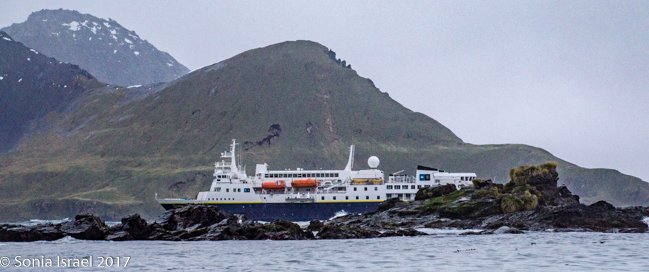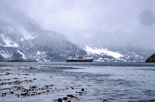 It was a cold, rainy and windy day. We threw on some warm clothes and made our way to the bridge. We were in a cove of the southernmost fjord in South Georgia, Drygalski Fjord, at the very end of it, standing in front of huge glaciers. This fjord is 8.5 miles long and its scenery was exquisite. There were snow petrels flying everywhere, their white feathers often blending into the snow behind them. We learned that 60% of South Georgia is glacier, but most of the glaciers do not make it all the way to the water’s edge. This glacier descends down the mountain right into the bay. It was white, with crevices in blue, and then whole large areas that were a frosted blue (which means the ice is more dense). The glaciers are so strong that they carve the mountains, giving the fiord a dramatic look. And the mountains? They are 6000-7000 feet tall.