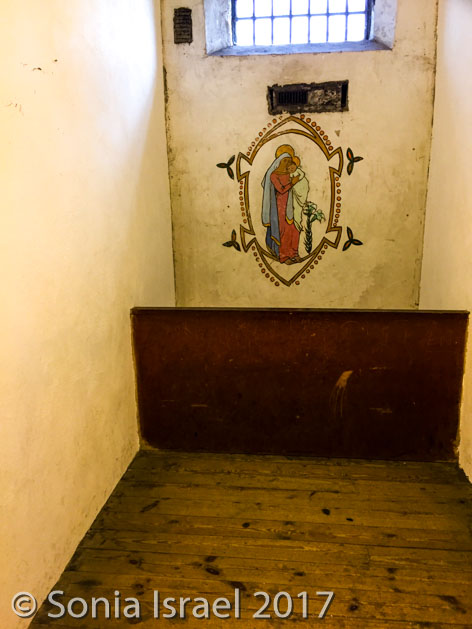 As we walked through the Gaol, we saw the original cells, tiny and dark. We saw the newer cells that surrounded a large courtyard with a glass roof letting in the light. Over the years, things certainly changed. But it was still a horrible prison. We saw the cell that held Grace Plunkett and the painting she made of Mary. Once released from prison, Grace Plunkett decided to devote herself through her art to the promotion of Sinn Fein policies and resumed her commercial work to earn a living. She was elected to the Sinn Féin executive in