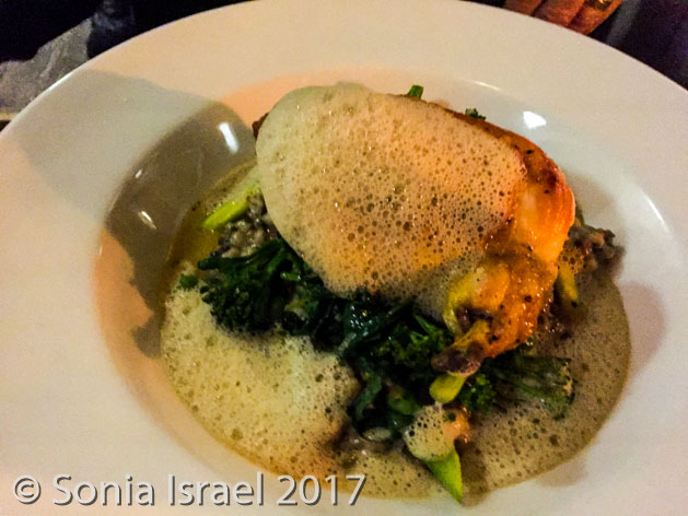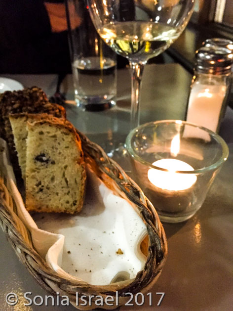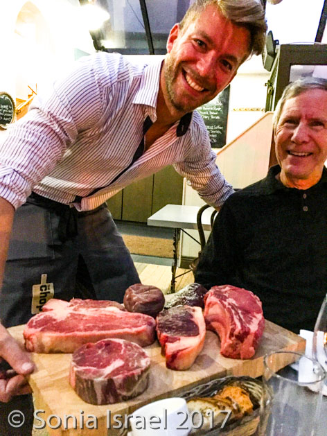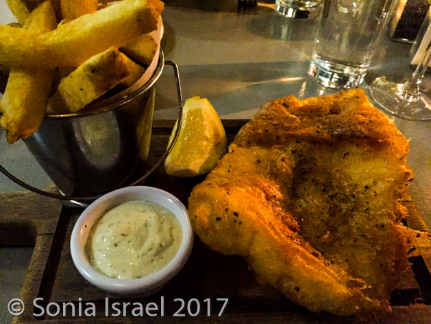 We walked into the Chophouse which had a quiet pleasant atmosphere. We were seated at a window overlooking the outside patio. The staff was extremely friendly and our waiter, Lucas, gave us excellent service. When he had our drink orders and had served us our wine and beer, he brought over a wooden board with the different cuts of meat, explaining each in detail. It was a hard choice, but I ended up with fish and chips and Andy with chicken. My fish was the largest I had ever seen in a fish and chips dish, and was delicious. Andy reported the chicken was the best he had ever had (and we eat a lot of chicken). The dessert menu looked great, but we were defeated by the large portions of our main courses (and maybe the bread…which was fabulous). Just goes to show that you don’t have to have steak at a chop house.