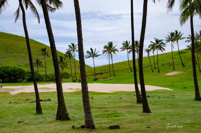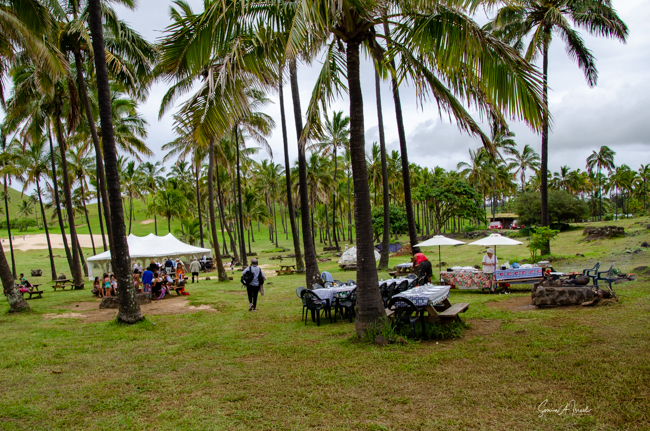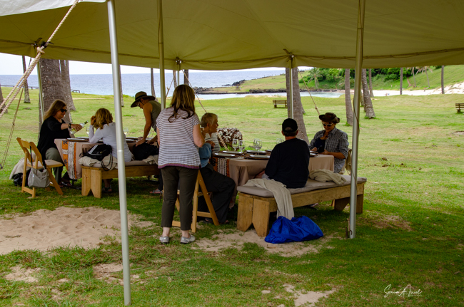 Our bus was taking us to the beach for a barbeque lunch. We arrived at Anakena Beach, which has large grass expanses and a small coral sanded beach surrounded by palm trees within the Rapa Nui National Park.