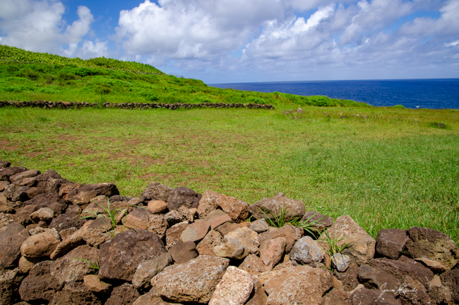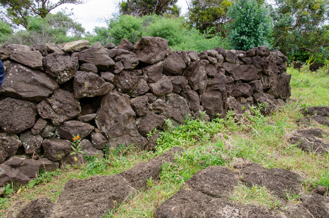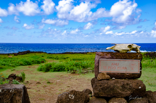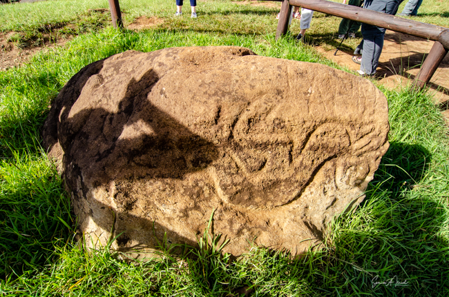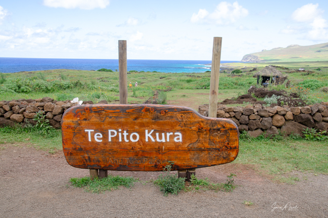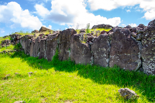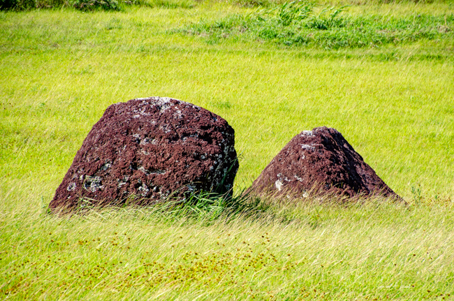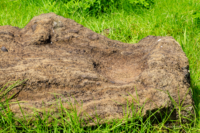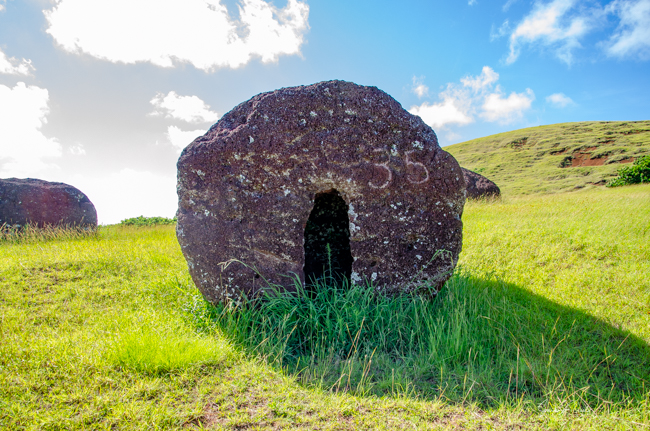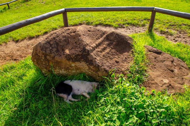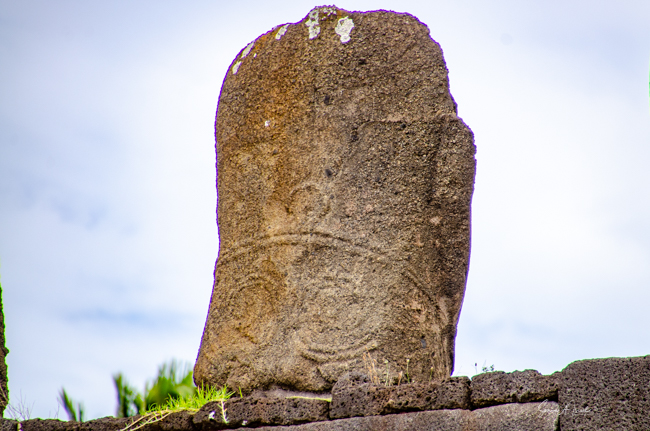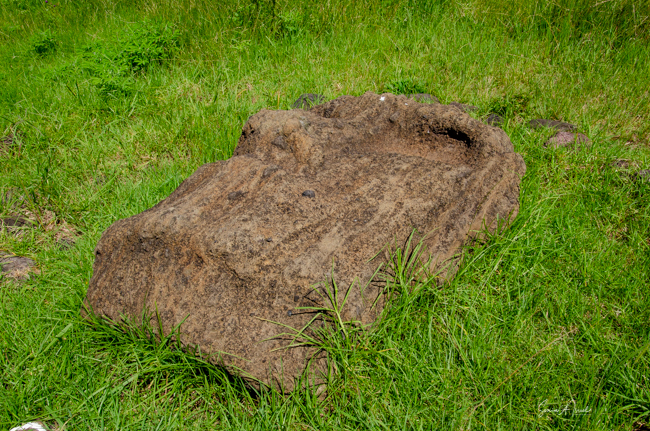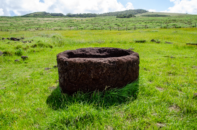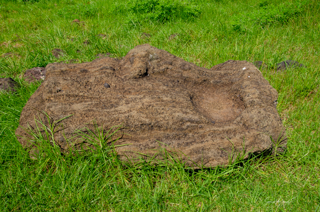 We walked across the field, following the cara cara birds, to a large oval stone (measuring 2.5 feet in diameter) surrounded by a stone wall at the edge of the water. The name Te Pito Kura means “navel of light” and it is believed that the name comes from the special qualities of this rock (as does the name of the island, Te Pito O T Henua meaning “navel of the world).
