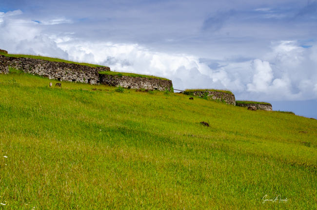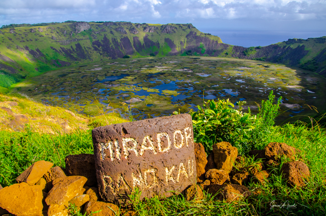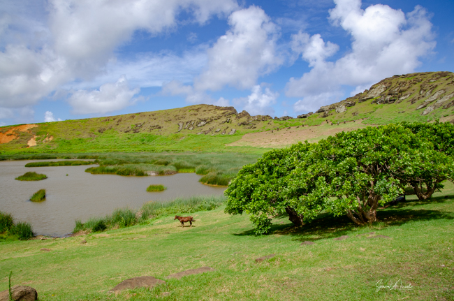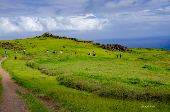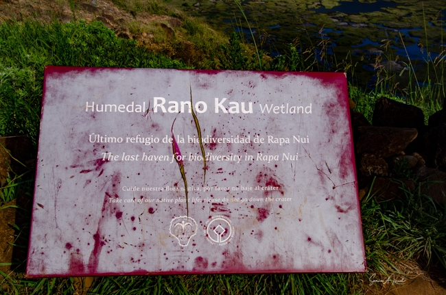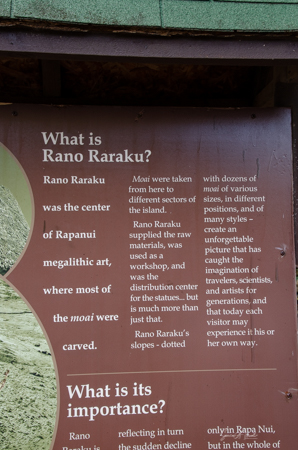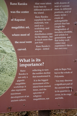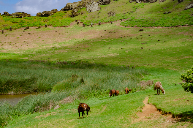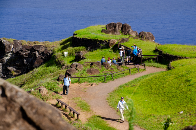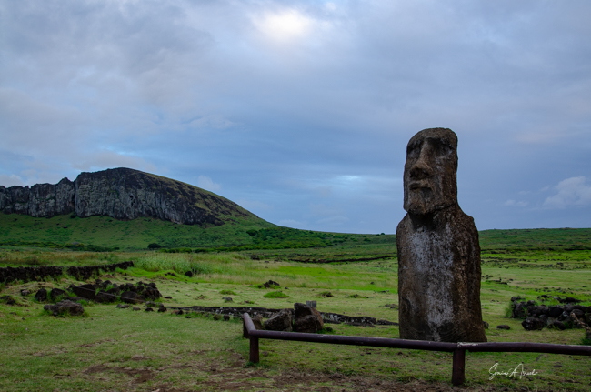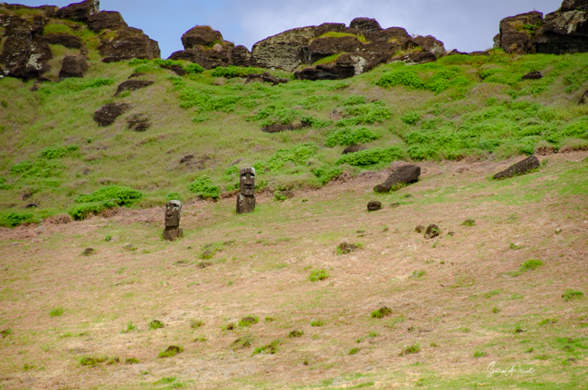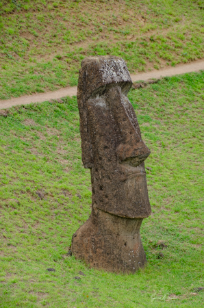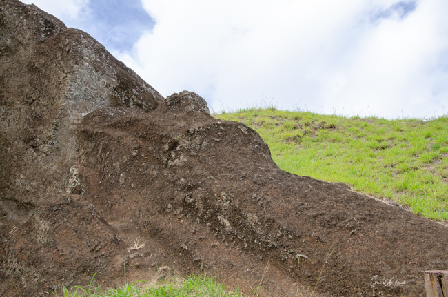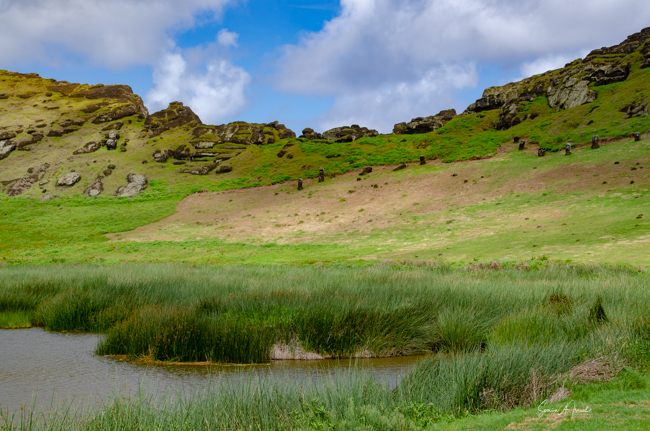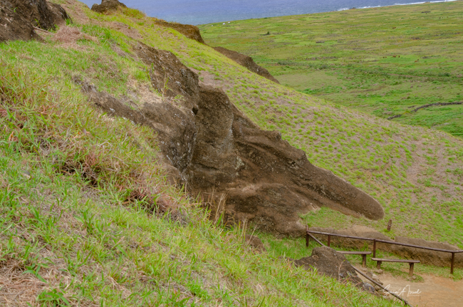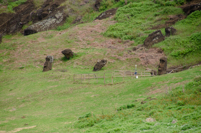 This quarry was once called Maunga Eo, meaning “perfumed hill.” The once grew a very aromatic plant here and you could smell it all around this area. There is a legend that two young female spirits came to the island, attracted by the aromatic smell. The name Rano, means ‘volcanoes that have an inner lagoon’ and Raraku means striped or grooved, referring to the grooves along the south face of the mountain. Of course there is a legend about that too. Raraku might be the name of an old character who, according to tradition, finished all the evil spirits of the island by murdering them with a moko or wooden lizard.