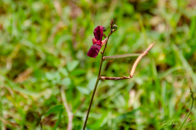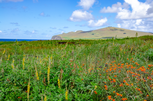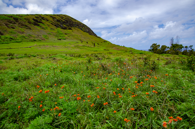 We arrived at the bottom of the mountain and looking up we could see parts of Moai scattered across the mountainside. We headed up the path and were awed by the beauty of the little red flowers growing everywhere and the blue of the ocean down below.