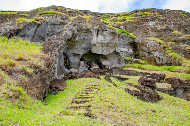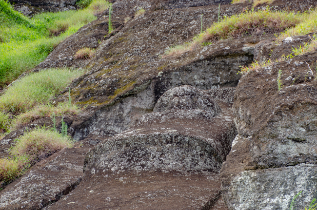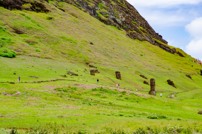 The statues were all carved up at the top of the mountain at the Rano Raraku volcano (see below to read about our visit here). There are still about 400 Moai at the quarry, either fallen over, or still waiting to be transported hundreds of years later. Tribes shared the quarry with about 15 men at a time carving, under the direction of master carvers. Being a carver was considered a high position with non-carvers being a lower class who had to collect food and bring it to the carvers.