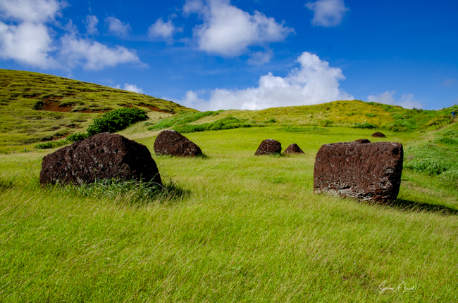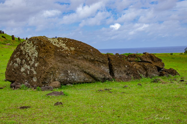 And then there is the oral tradition which says that the Hanua Momoko people who were the dominate tribe and were in charge of the carving, rebelled against their oppressors, the Hanau E’epe and killed them all in the battle of the Poike. Once these oppressors were gone, they liberated carvers never carved again. But these legends and oral tradition do not explain were tools just lying on the ground as if the carvers left for lunch and never returned. That is part of the mystery of the Moai and of Rapa Nui.