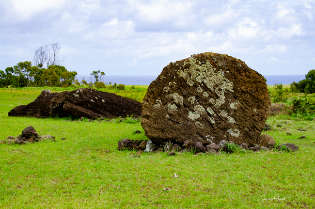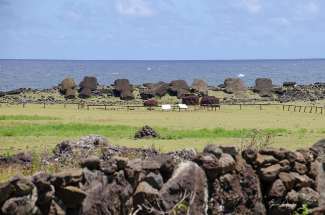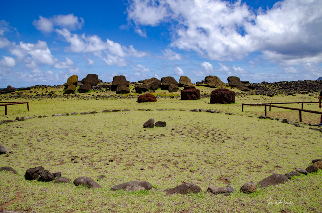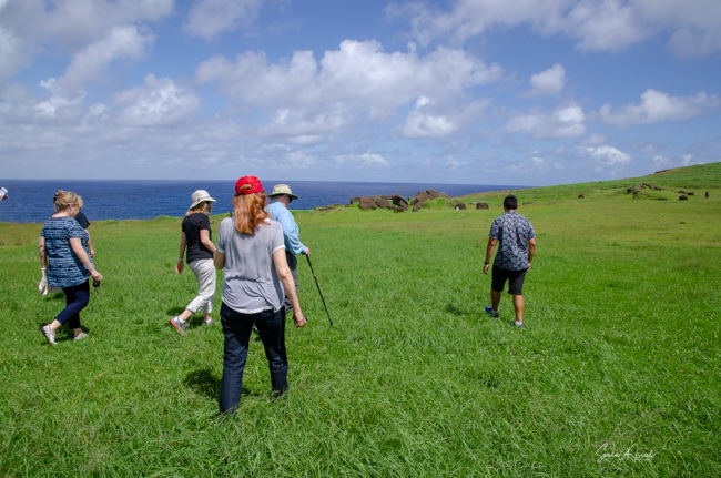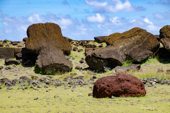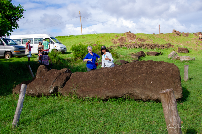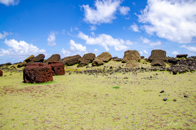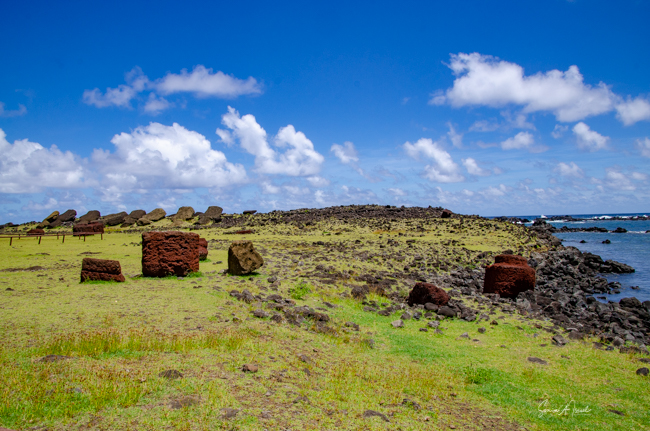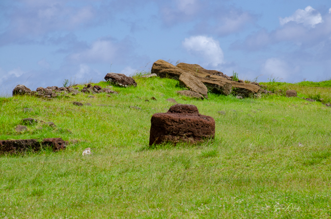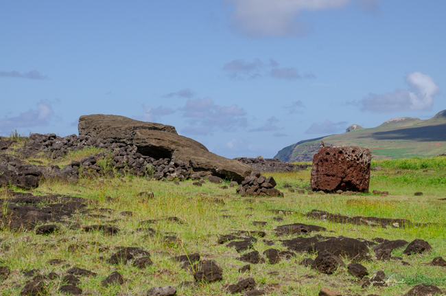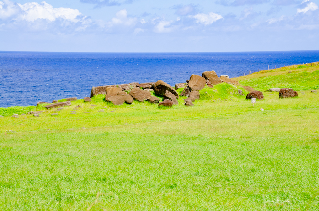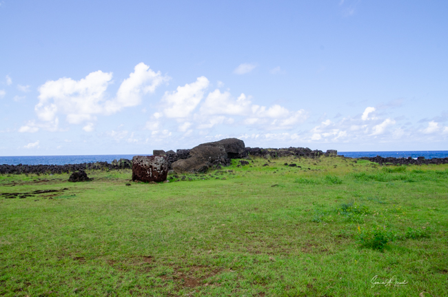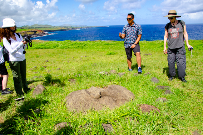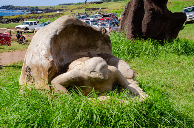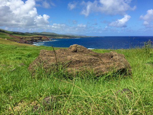 Another thing that is different here is that all the statues, eight of them, are still lying face down. They were not replaced and this ahu was not restored. And so we could get a better understanding of what may have happened, what the whole island looked like after the huri moai period (destruction of the Moai) in the 1700s when the tribes or clans fought each other. There were also some pukao on the ground and we were told that some of them had rolled into the water and were just recovered about 20 years ago.