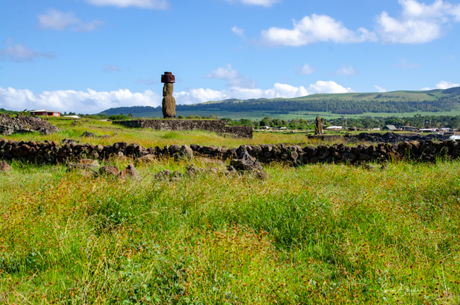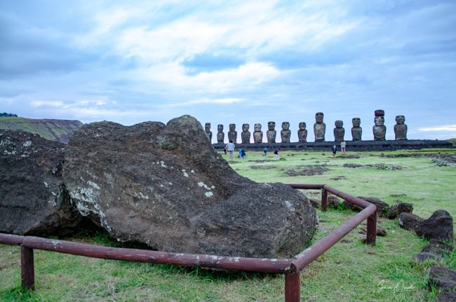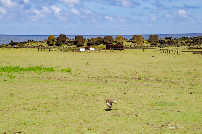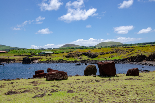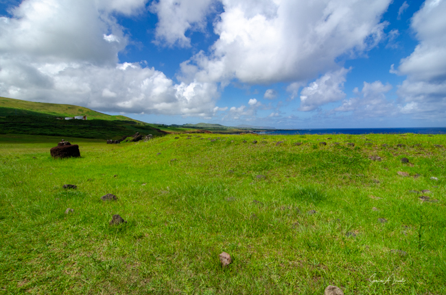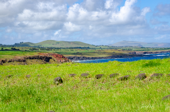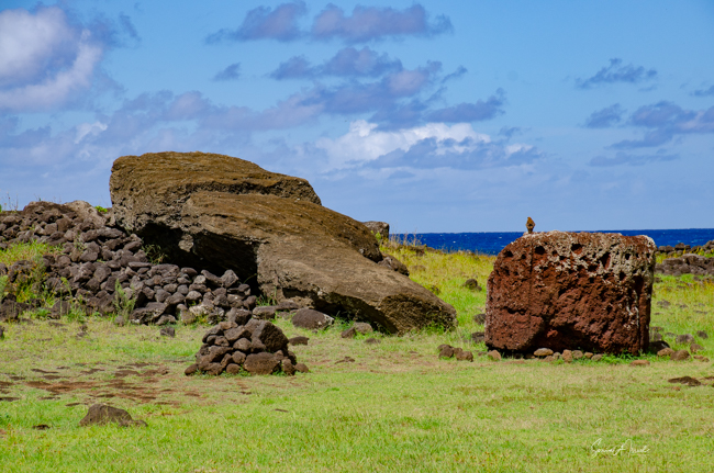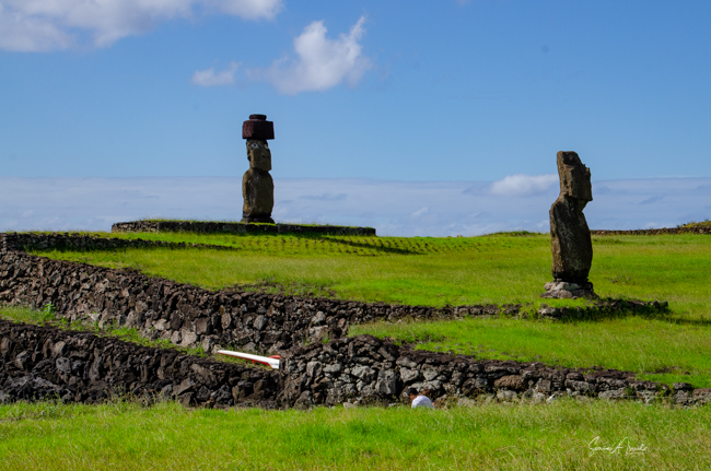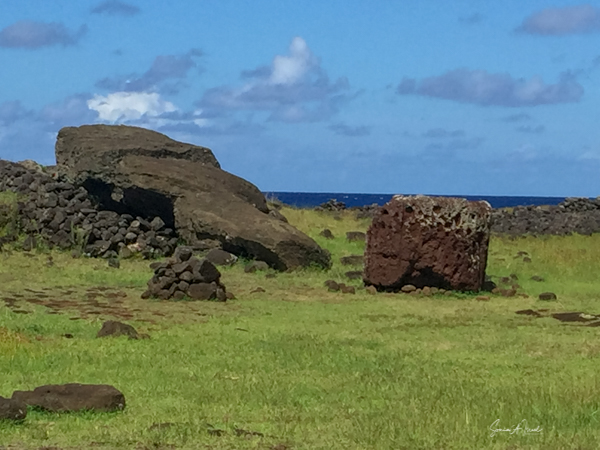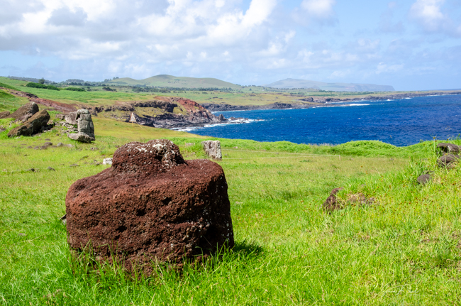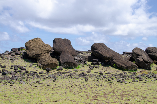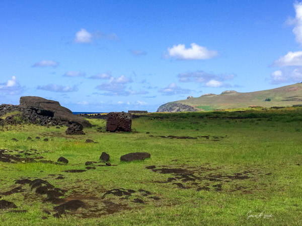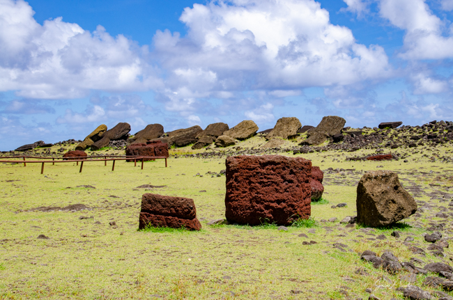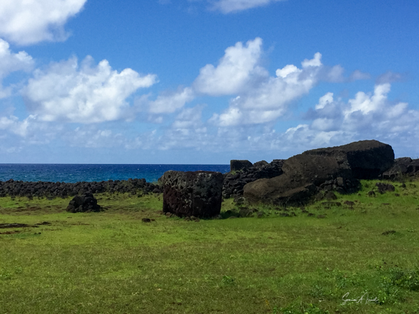 Another thing that is different here is that all the statues, eight of them, are still lying face down. They were not replaced and this ahu was not restored. And so we could get a better understanding of what may have happened, what the whole island looked like after the huri moai period (destruction of the Moai) in the 1700s when the tribes or clans fought each other. There were also some pukao on the ground and we were told that some of them had rolled into the water and were just recovered about 20 years ago.