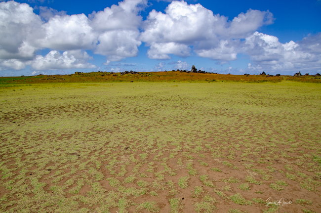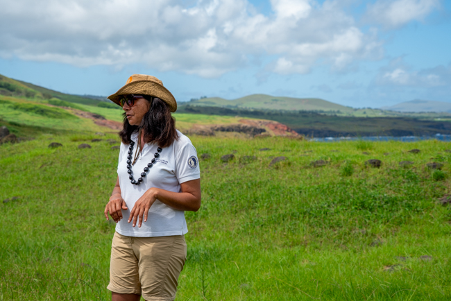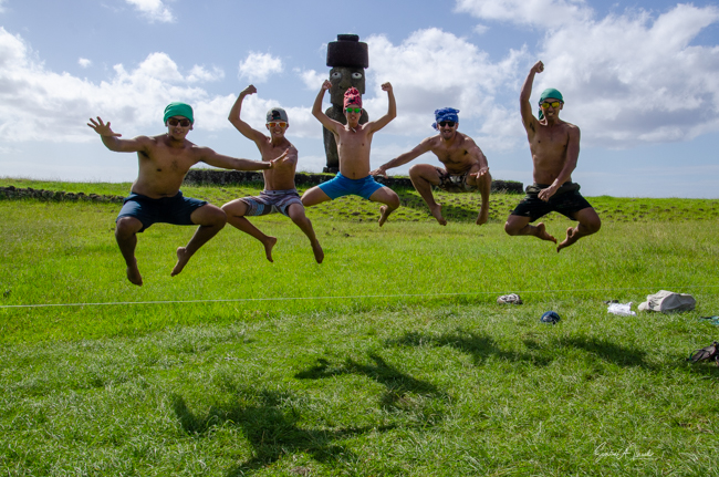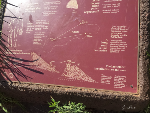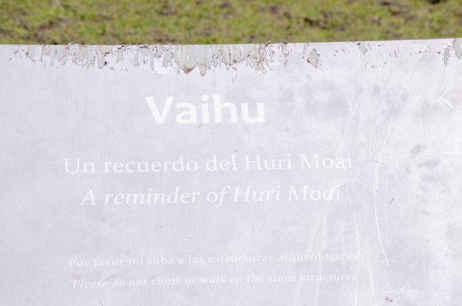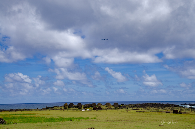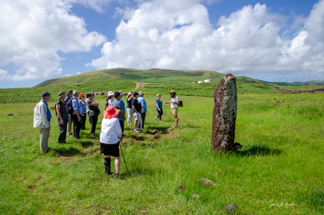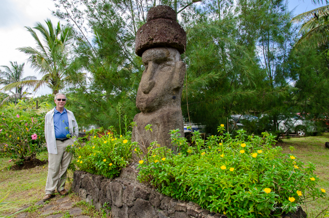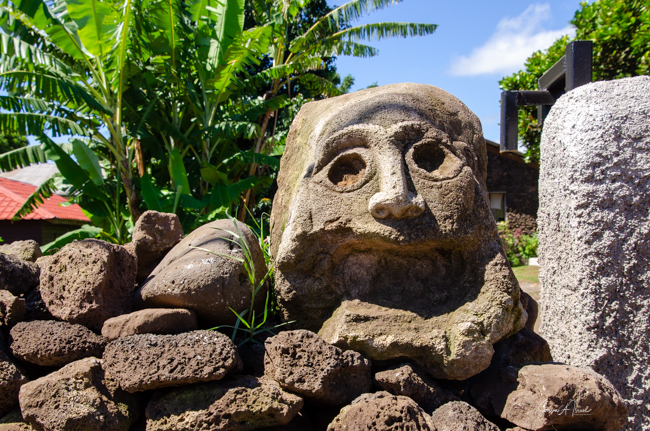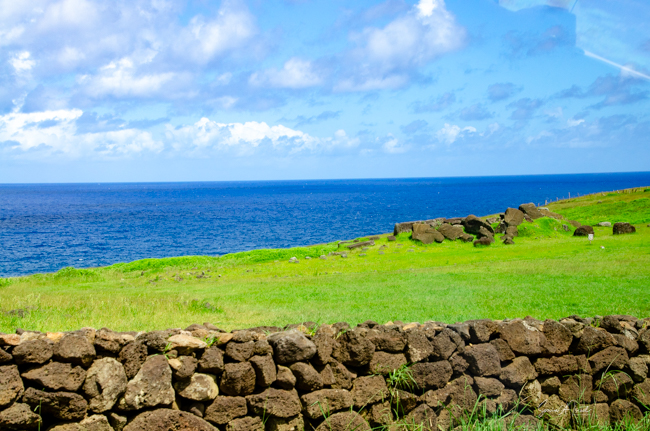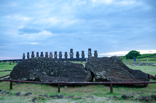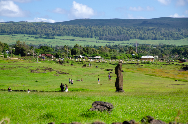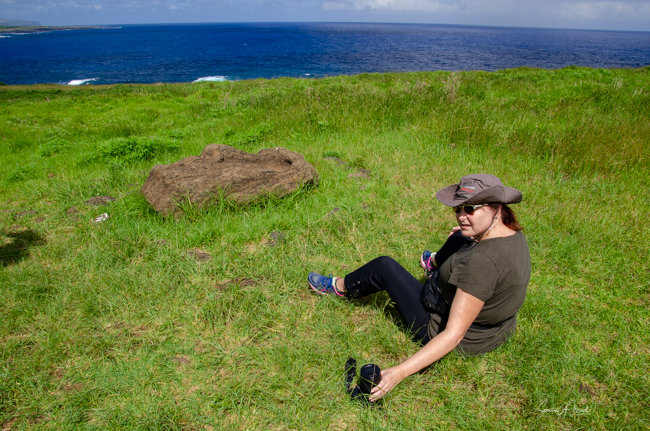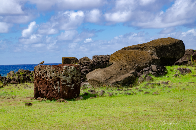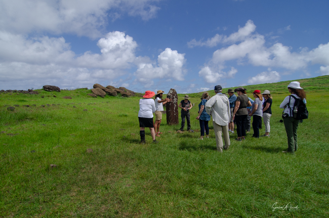Another thing that is different here is that all the statues, eight of them, are still lying face down. They were not replaced and this ahu was not restored. And so we could get a better understanding of what may have happened, what the whole island looked like after the huri moai period (destruction of the Moai) in the 1700s when the tribes or clans fought each other. There were also some pukao on the ground and we were told that some of them had rolled into the water and were just recovered about 20 years ago.