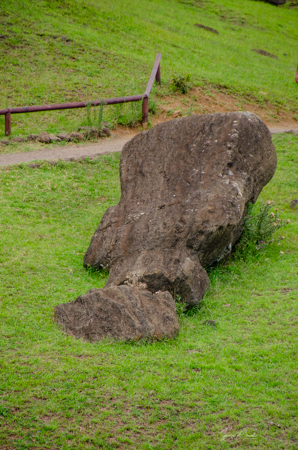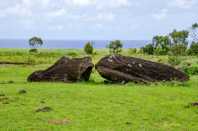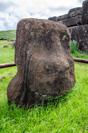 As part of the fighting, warriors tried to steal the mana (power) by pushing the Moai off the platforms. It is now known that this was intentional as there were stones placed right where the head would strike it and break. If the Moai fell face up, the eyes were destroyed. And so, within 150 years not a single Moai was left standing.