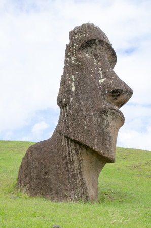 It is believed that the Moai were originally carved somewhere around 1100-1680. Today there are about 887 of these monolithic statues. They have torsos, most of them ending at the top of the thighs, although a small number are complete figures that kneel on bent knees with their hands at their sides or over their stomachs. They have stylized elongated faces with long ears and thin lips. Each one, however, is different because they were made to capture the image of the chieftain or of their ancestors. Their fingernails are long meaning that they were royals and not farmers. Some upright Moai have become buried up to their necks by shifting soils. Some of them are carved both in the front and on the back, with designs similar to the tattoos seen in Polynesian cultures.