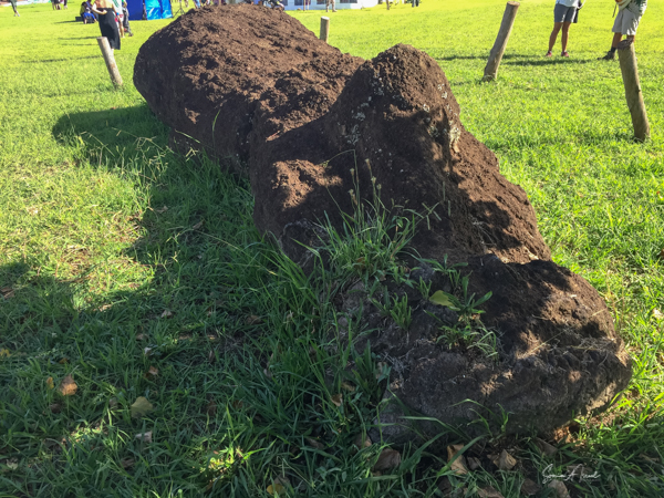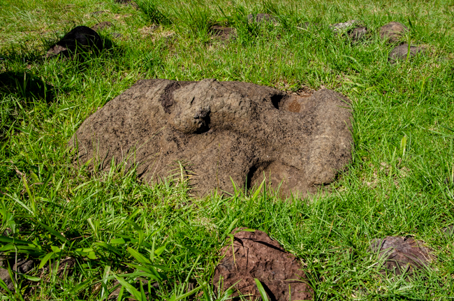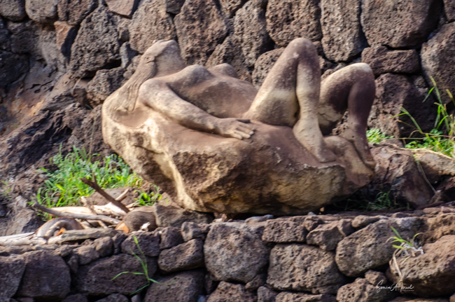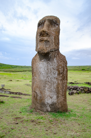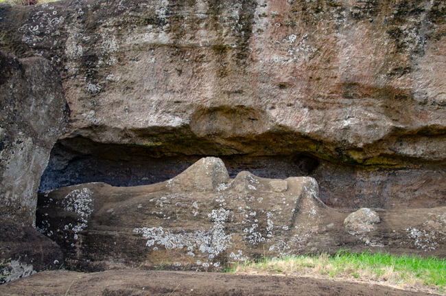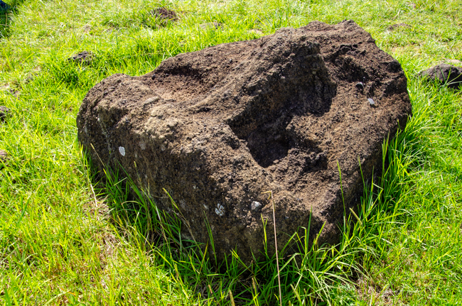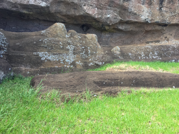 We walked over to the center of the large square where there was another huge Moai, but this one was lying down on its back and looking up at the sky. It was split in two parts and its eye sockets were not yet carved. As I mentioned above, the eye sockets were carved once the Moai were upright on the ahu and the coral eyes were added in order to grant them their ancestor’s spirits. So this one never made it to the ahu.