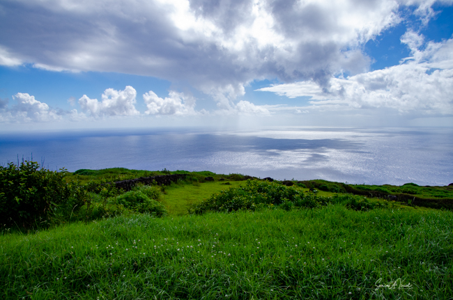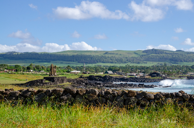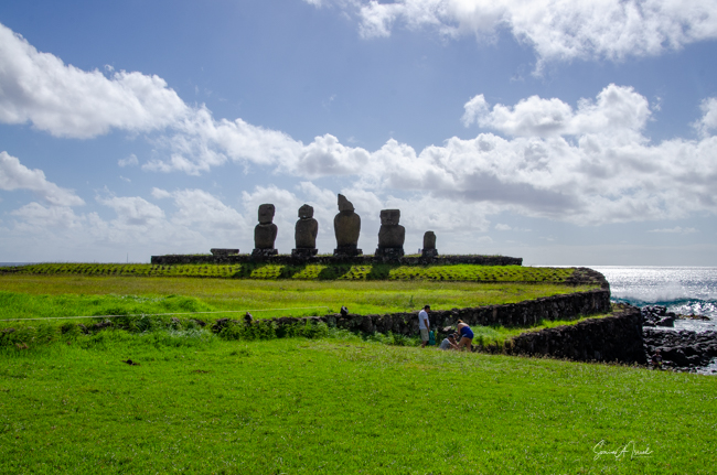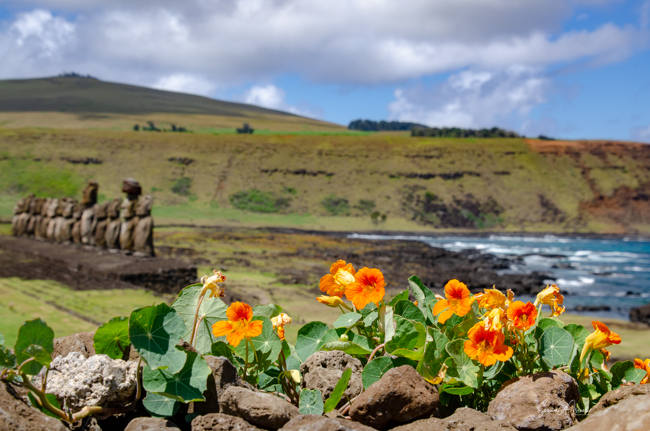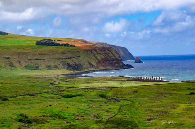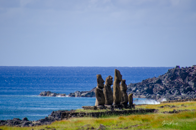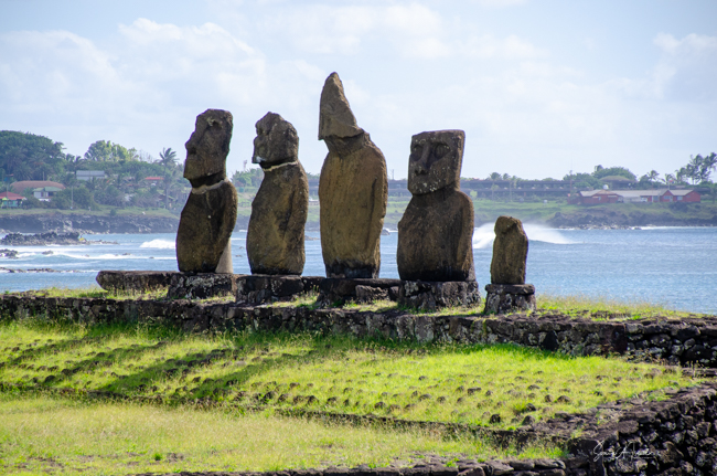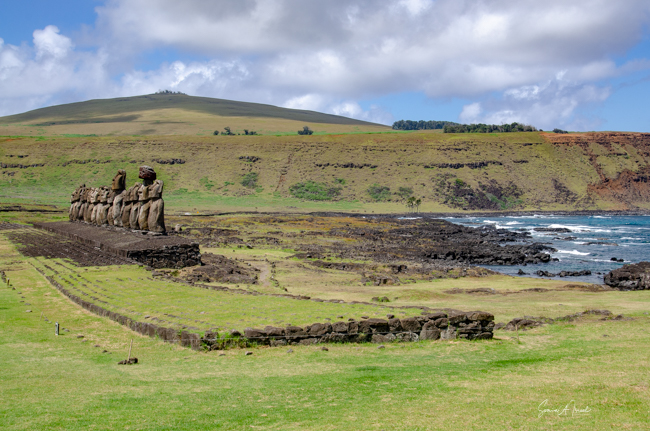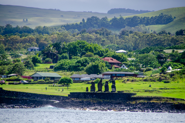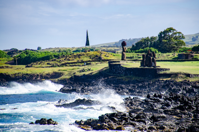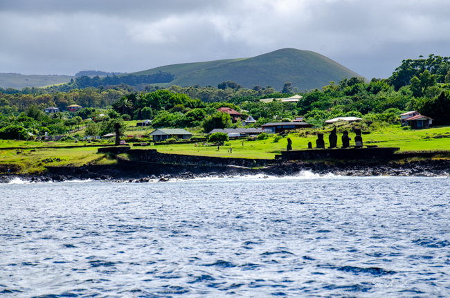 The Moai at Ahu A Kivi are different than all the other Moai. Why? Because while all the other Moai face inland, with their backs to the ocean, these Moai are not on the coast, but are inland and are facing out, towards the ocean.