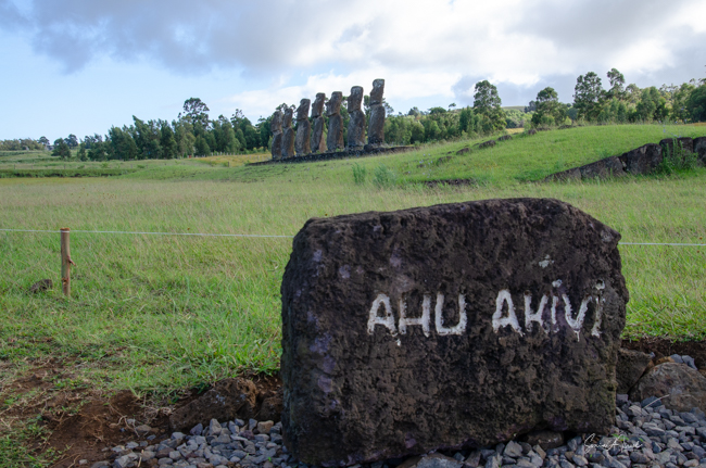 There is however one group of seven Moai, on Ahu Akivi, who do face the sea (more on this below). These Moai are all of equal size and shape. This ahu is also unusual because it is one of the few inland ahus. These seven Moai represent the seven navigators that first found the island. They say that those seven brought one Moai with them. And they face outward as they are facing their home, the Marquesas Islands.