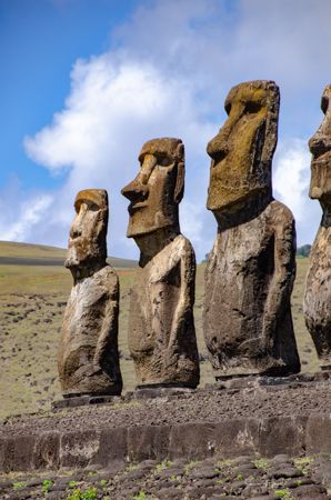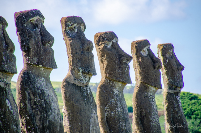 The Moai, whose full name is Moai Aringa Ora which means “living face of the ancestors,” are carved human figures with oversize heads, with each statue built to