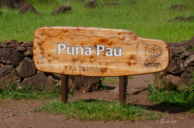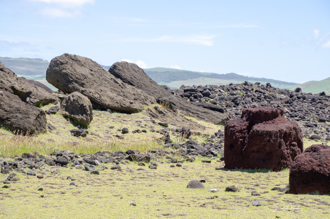 While the Moai were carved at the quarry at Rano Raraku, the pukao (topknots) were carved here at Puna Pau, the source of the red scoria (called hani hani in Rapa Nui). The scoria is a type of volcanic ash with is somewhat soft and has great porosity and has iron oxide in it which makes it look red. It was used for other things besides the pukao, including special vessels for water called taheta and for the Moai’s eyes.