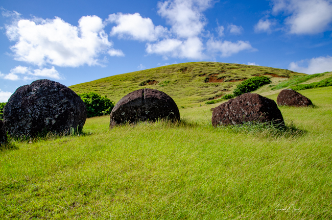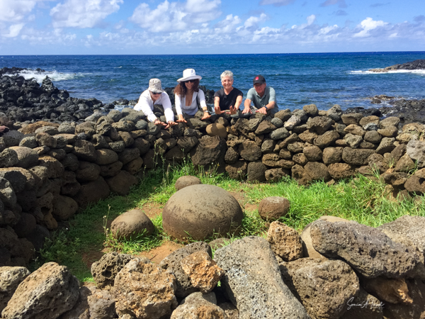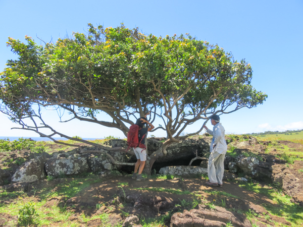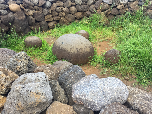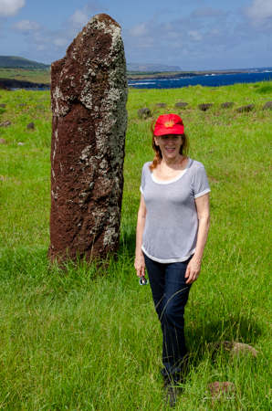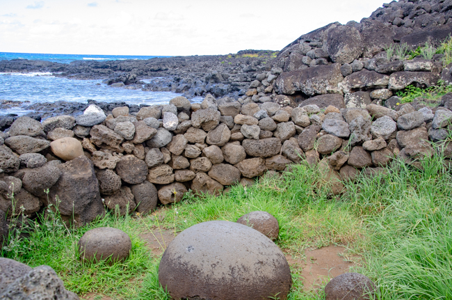 And here is the rest of the story. This rock was once called “Tita’s hanga ‘o te henua” and was brought by boat by Hotu Matu’a, the king of the Rapa Nui people. Legend continues that this rock, which is almost spherical and is very smooth, concentrates a magnetic and supernatural energy called mana. The stone has a high iron content and thus warms up more than most stones. This heat causes a compass to behave strangely. As many other tourists do, we stretched our arms out towards it (no longer are you allowed to touch it) to feel its power.