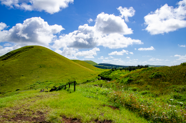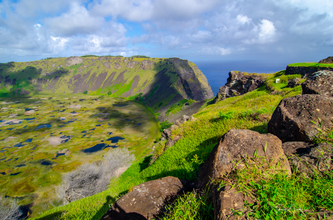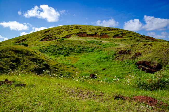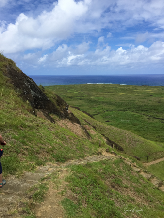 After we made our way back to the bottom, our guide suggested a hike back up the other side of the fork in the path. We had climbed to the right, but the path to the left took them to the crater of the Rano Raraku Crater. Most of us were exhausted, but Andy and Alan joined him back up the mountain.