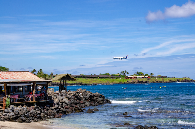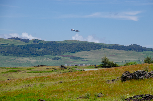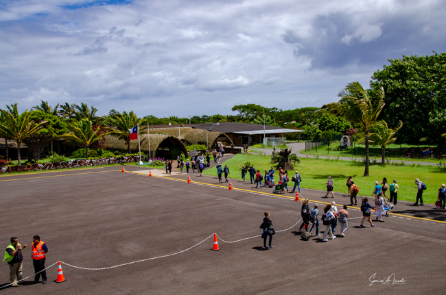The Mataveri International Airport (or Isla de Pascua) in Hangaroa reminded me of the airport in Hawaii 30 years ago. It was small and smelled wonderful. We walked off the plane (no jetbridge here), and then we just hung around the tarmac looking at the mountains all around us. Our luggage took forever to arrive (you would think in such a small airport that it would have been quick. You would be wrong).