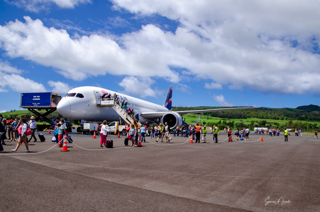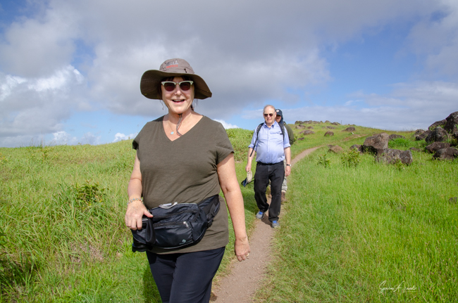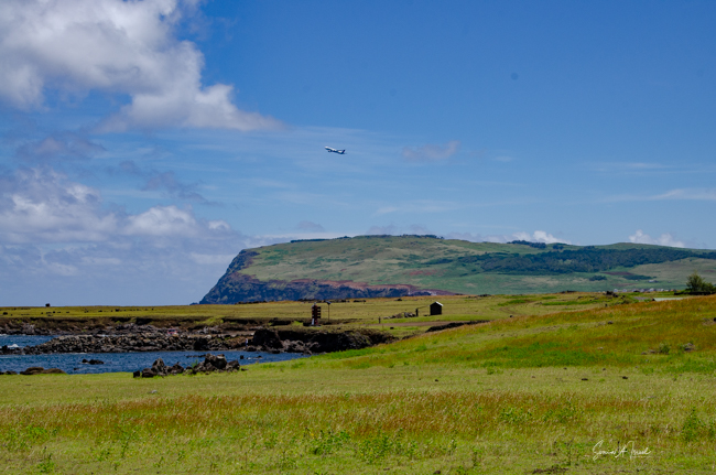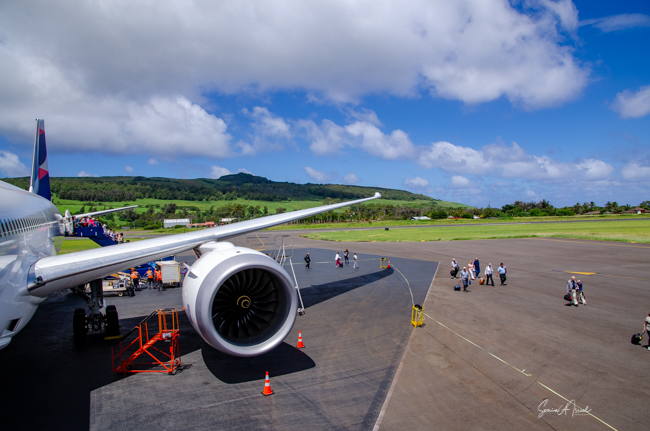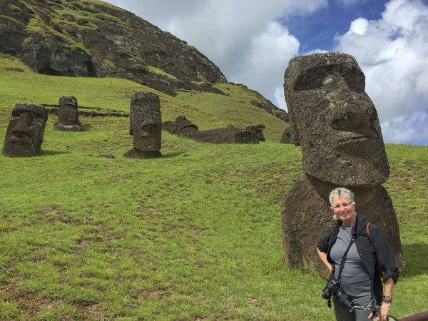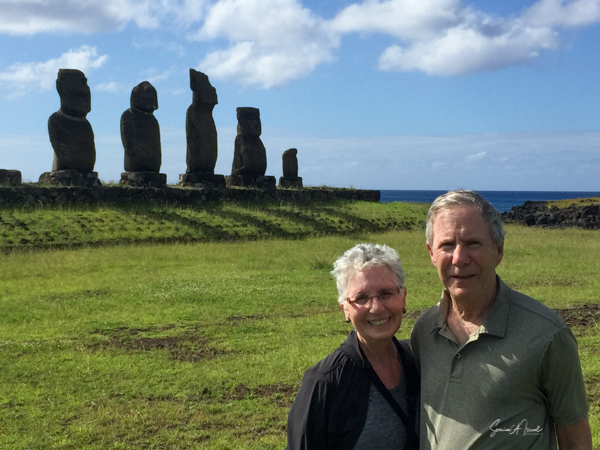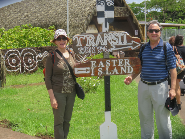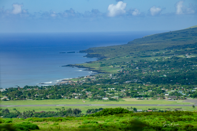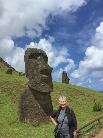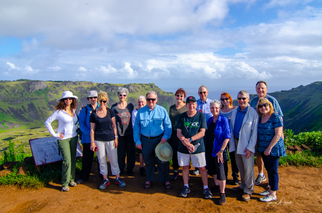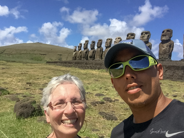 Our trip started in Santiago which we had visited before, so we just spent the one night before leaving for Easter Island, in the middle of the Pacific Ocean and the most remote island on Earth. We flew Latam Airlines on the Dreamliner. We got to sleep some as it is over a 5-hour flight. Easter Island really is in the middle of nowhere. As we approached, we could make out the triangular island that would be our home for the next week. We were traveling with Abercrombie & Kent (A&K) along with our friends Melissa and Michael, Helene and Alan, Sherry, and Phyllis. Note please that a few of the photos are from Helene and Melissa. We had several wonderful guides, including Nune Hucke, Lili Pate (who was the queen of the Tapati in 2012, see more about that in the Tapati post), and others.