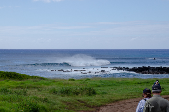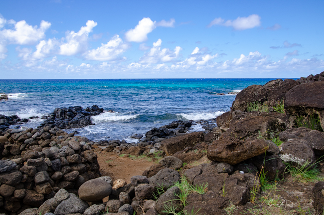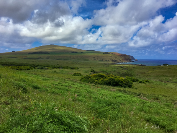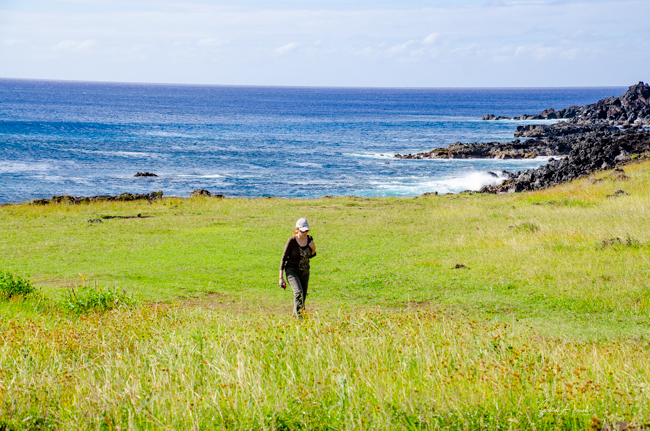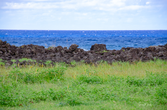 We had quickly discovered that each site was different with its own special characteristics and beauty. Vaihu (meaning “place of water”) is different in many ways. First, it is more remote than the other ahus we had visited so far. It sits on the Hanga Te’s Bay and was one of the farther sites, being about 6 miles from Hangaroa. As we walked towards it, we saw the cliffs framing the site and heard the ocean waves breaking loudly on the shore.