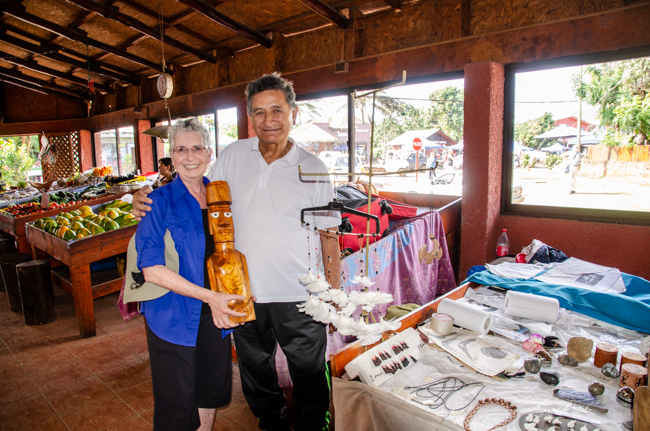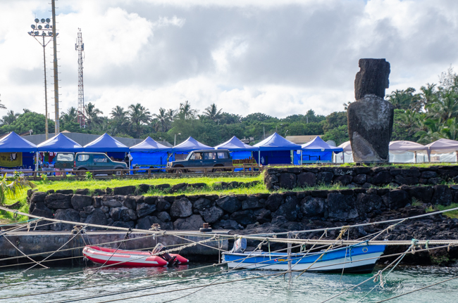 Hanga Roa (or Hangaroa) (Hango means bay; Roa means long or wide) is the main town in Rapa Nui. The town is just a few blocks long. We strolled past stalls set up to sell souvenirs and food for the festival. We walked along the water and we saw our first Moai. There were three lined up. But these were replicas. We had yet to see the real thing.