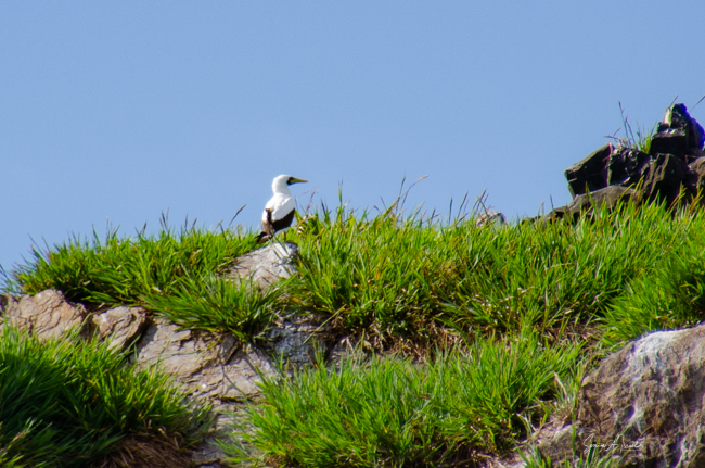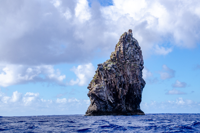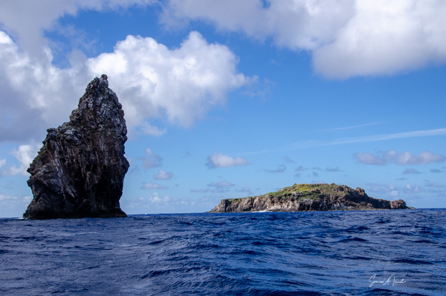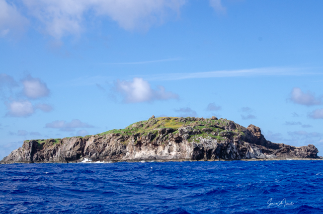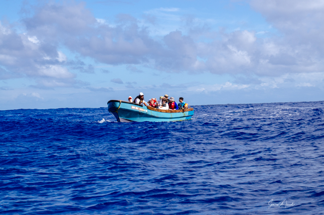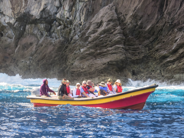 One nice thing about being on an island is that there are lots of boats and lots of opportunities to go boating. Our group walked into town, were given red or orange life jackets to wear, and were assigned to one of two motor boats. And off we went. Our destination was the waters just under Orongo, to the large island of Motu Nui (which means large island…). Just below Orongo, as you can see in the pictures above (see the Orongo section), are three small islands. All three have seabirds on them, but as explained above, the birdman ritual involved swimming to Moto Nui, which rises 6562 feet from the sea bed.
