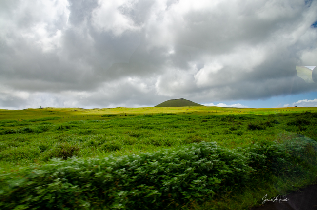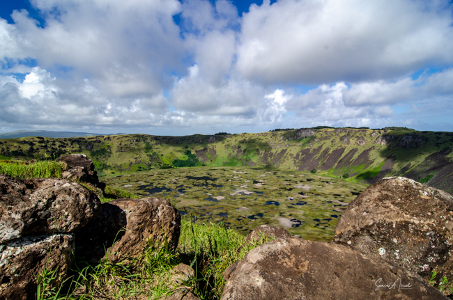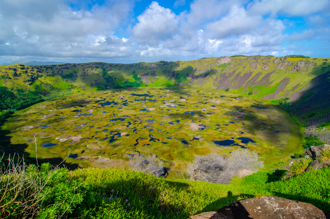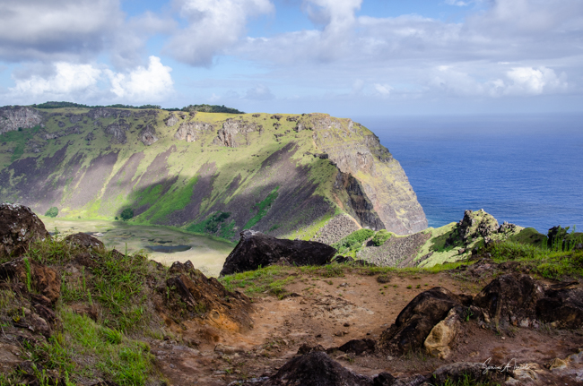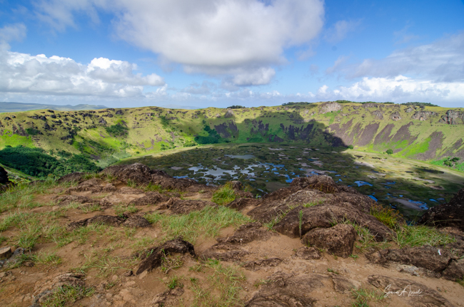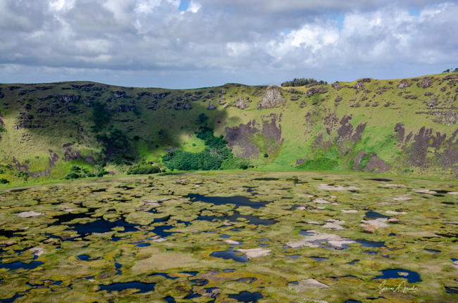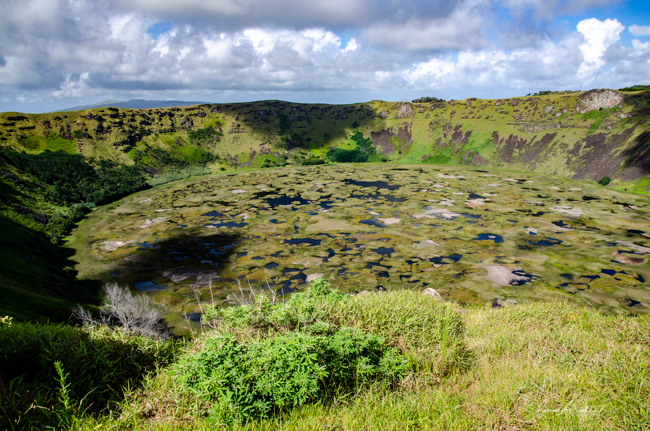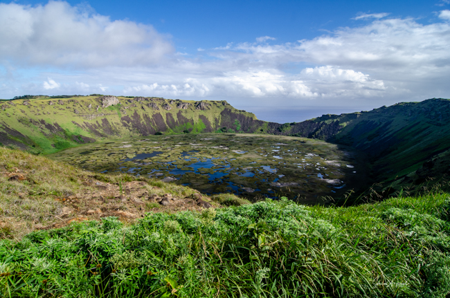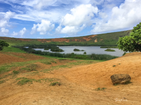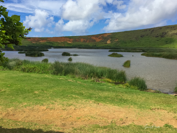 When they came back down, they told us that the first part of the walk was fairly easy. But after a few minutes, the path got steeper and steeper up the side of the volcano. While there were dirt stairs, it was still a difficult climb. Those of us that had remained below were happy to just see the pictures of the freshwater lake in the middle of the crater. This is one of just three freshwater lakes on the island and it surrounded by nga’atu or totora reeds which have been growing here for tens of thousands of years and is used for thatched roofs and for the sled used in the Tapati Festival (see post on the Tapati).