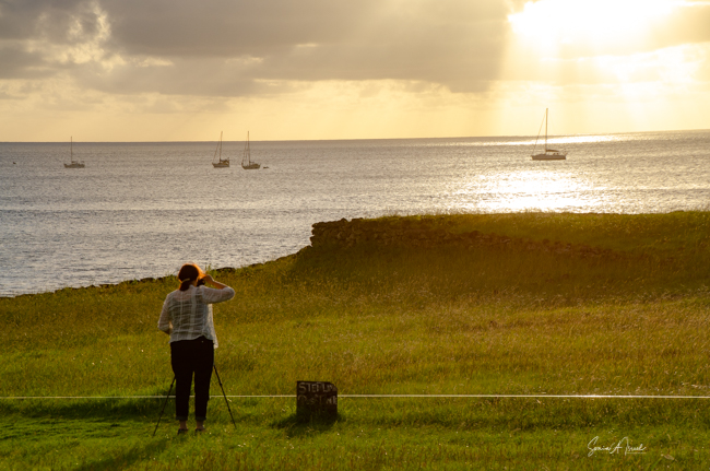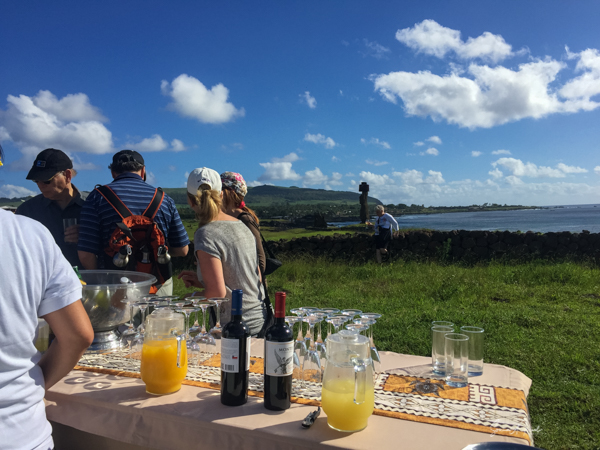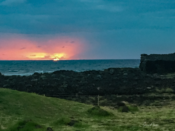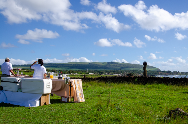 As we walked up the mountain and back down again (not an easy walk), we were literally stopped in our tracks as the spectacular view below hit our eyes. We could see all 15 Moai at Tonjariki, silhouetted by the ocean behind them.