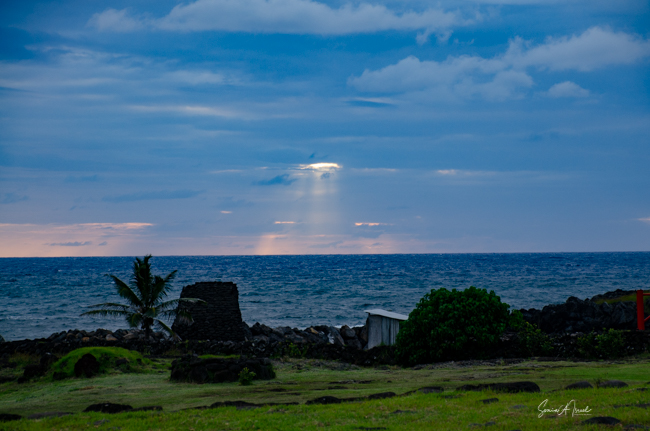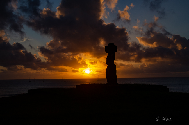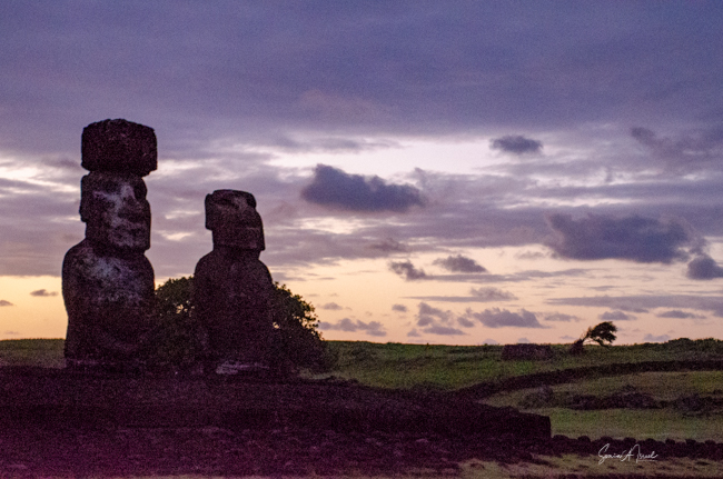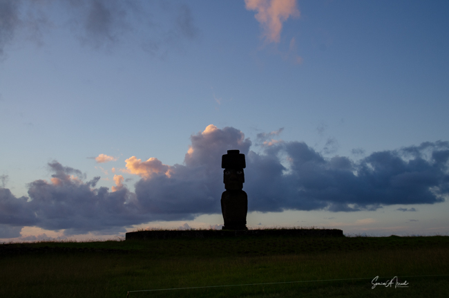 She ran crying to the place where he always et her loved one and she told him of the tragedy. He promised that he would rescue her and that in order to do so, she would need to pretend that she had accepted the king’s decision. Tongariki knew the route that the canoe would take. So, during the relocation ceremony to the cave, he hid between the nearby rocks from where he would attack the vessel and steal away his beloved Tiare. As the canoe came closer, the young man jumped onto the vessel, grabbed his love and swam with her towards the shore. They his in a place that only they knew about on the Anakena Beach. When the king heard that his favorite maiden had fled with a young man from tan enemy tribe, he was so angry that he cast a bad spell over them; the first kiss that they shared beneath a full moon would turn them both into stone. And so it was that when the lovers kissed each other in the moonlight, they became the stone statues looking out over Anakena Beach.”