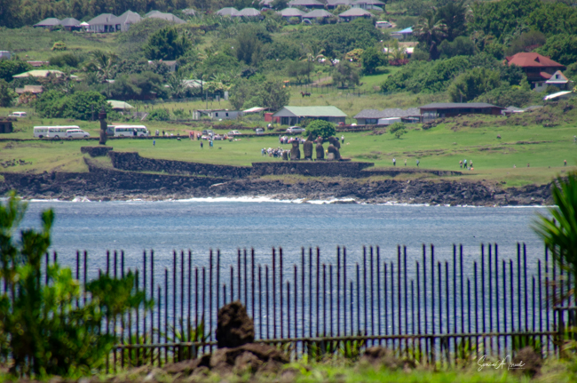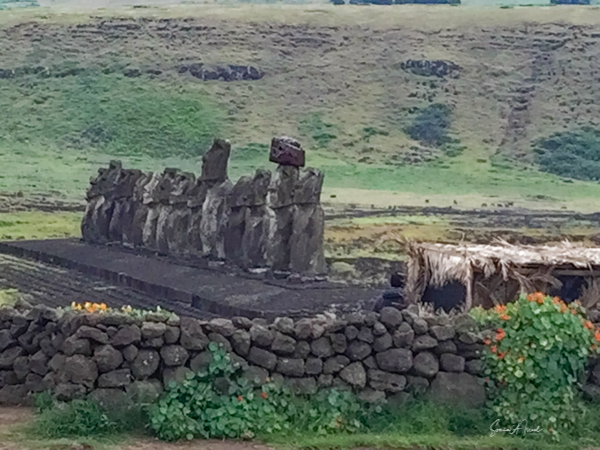 The main, central platform, like many others, is oriented to the rising sun of the summer solstice. It is almost 656 feet long and as I mentioned, holds 15 Moai, more than any other collection of Moai.