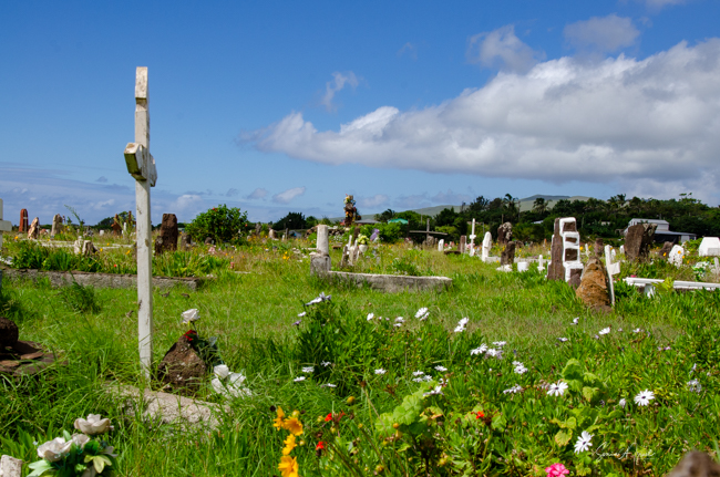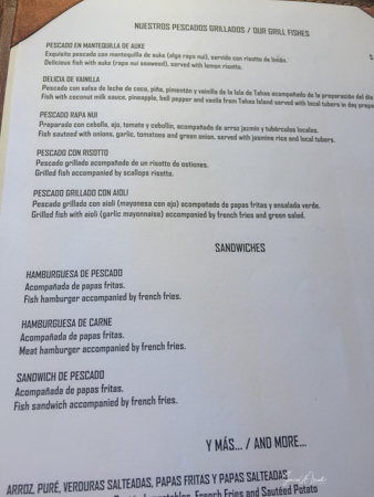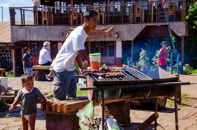 The second main street is Te Pito or Te Henua Street, meaning the “naval of the world” in Rapanui. This street begins at the sea and ends at the Church of Santa Cruz. The fire station the schools and more restaurants and shops are located on this street. The post office was also here (an important stop, as we got an Easter Island stamp in our passports. I recently learned that these type of stamps (like in the Galapagos or Macho Picchu) might invalidate your passport!),