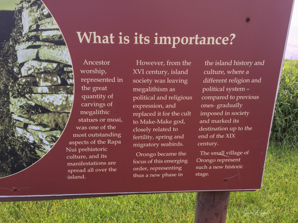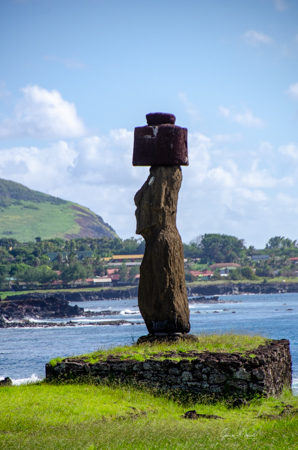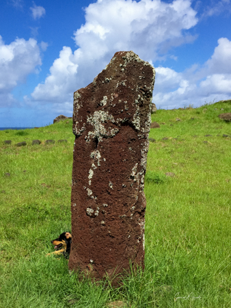honor an ancestor and representing the deceased head of a lineage. As an aside, although the ancestors were being honored by the Moai, they were not necessarily nice people. In particular, they were not nice to children. Anyone could kick a child and the elderly who were sick were abandoned. Our guide, Nuni, who was 9th generation Rapa Nui, remembered all this.