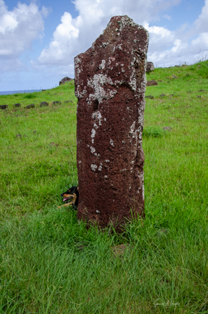 As we were standing admiring the seven Moai, we noticed a single Moai, standing sadly by himself, up on the hill, as if he were peeking between the Moai on Ahu Nau Nau.. This was Ahu Ature. This was the first Moai to be re-raised on the island.
