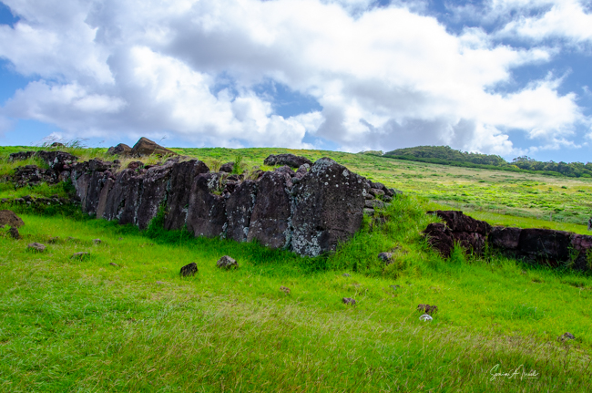 The important Moai were placed on stone platforms called ahu, which was the focal point of the tribe. Each ahu had a retaining wall several feet high and facing the sea and a sloping ramp extending out like wings. There is a smaller platform in front of the larger one where the ceremonies would take place. There are rectangular stones representing the family with smaller smooth stones or little points in the rocks representing the children.