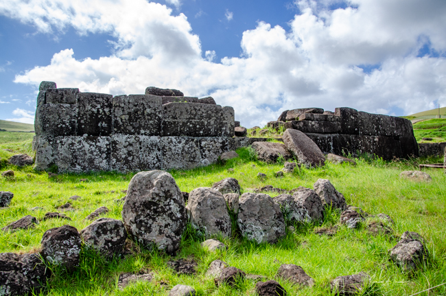 But like everything on Easter Island, there are always more stories. This platform aligns with the sun on September 23, the spring equinox. In this way, the locals knew when the new season was beginning and when they should start fishing. Some say that is why the Moai face the sea. And if you walk around this ahu you see remains of an old settlement that was built inland. So it is possible that these Moai were looking at the settlement and it just happened to also face the ocean. I like the first story best.