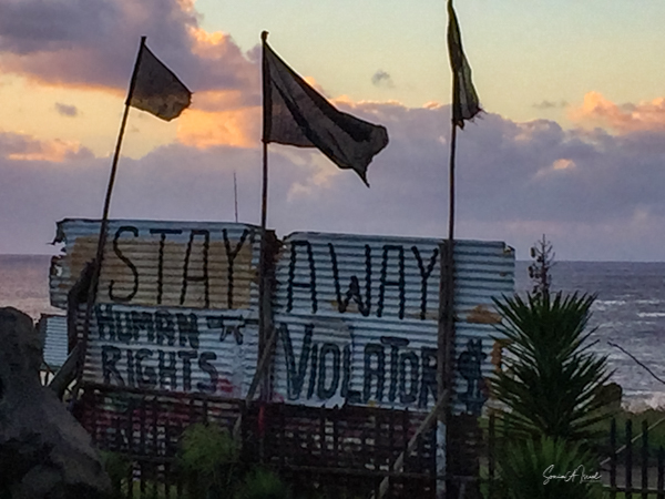 We had a lovely view from our room. But there were also protest signs. Seems that the hotel was given a long-term concession to build on land that belongs to the municipality. The land was sold to the city many, many years ago, by the former native owners, who were given a fair price and moved to other land. But the descendants of those former owners want the lands back. Thus the protest signs.