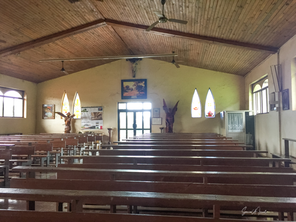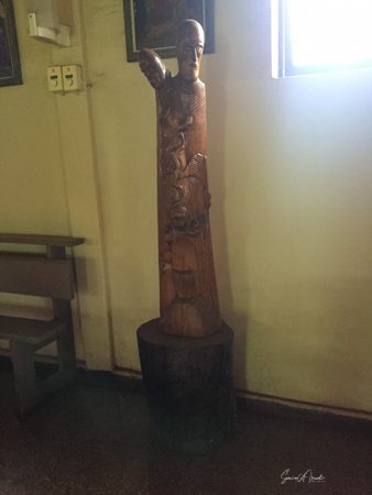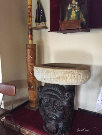 The inside of the church is very simple, basically one large room. But it is the statues around the hall that make it interesting. There is a carving of the archangel Saint Michael and one of Saint Francis of Assisi with arms outstretched, reminiscent of the Moai. And the baptismal font has a representation of a Rapa Nui divinity under carvings of Rongo Rongo symbols.