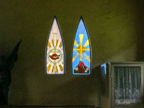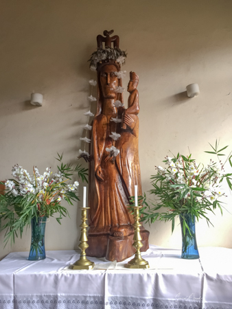 There are more areas of symbiosis. There is a sacred heart with a sinister face resembling that of the Moai. Its chest is decorated with a rei miro, that is, an adornment in the shape of a crescent that hung the beads found of the chest of the Moai and that is the main symbol of the Rapa Nui flag. And even the alter has a crucified Christ wearing a headdress made with shells and fish bones. And to the right of the altar is a second altar dedicated to Santa Maria de Rapa Nui (Our Lady of Rapa Nui) who was the patroness and protector of Easter Island.