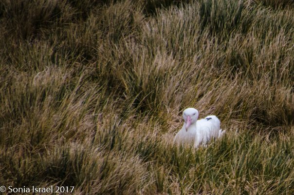 At the edge of the beach was a boardwalk, used to reduce the impact of our boots. And where did the boardwalk lead? To nesting albatross. And petrels. As we climbed up the boardwalk, the wind felt like it was literally blowing me away. I had to hold on to the handrail, when there was one, to keep upright. But when we got to the top, the view was spectacular. The blue/gray waters. The mountains. And the birds. The wandering albatross, sitting on their nests. It was cold. It was wet. It was beautiful.