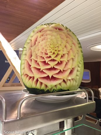 That night we had a special Philippine dinner. Most of the crew are from the Philippines so they made us one of their special dinners. Every staff member wore the traditional dress. And the buffet line was decorated with the most magnificent carved fruit.