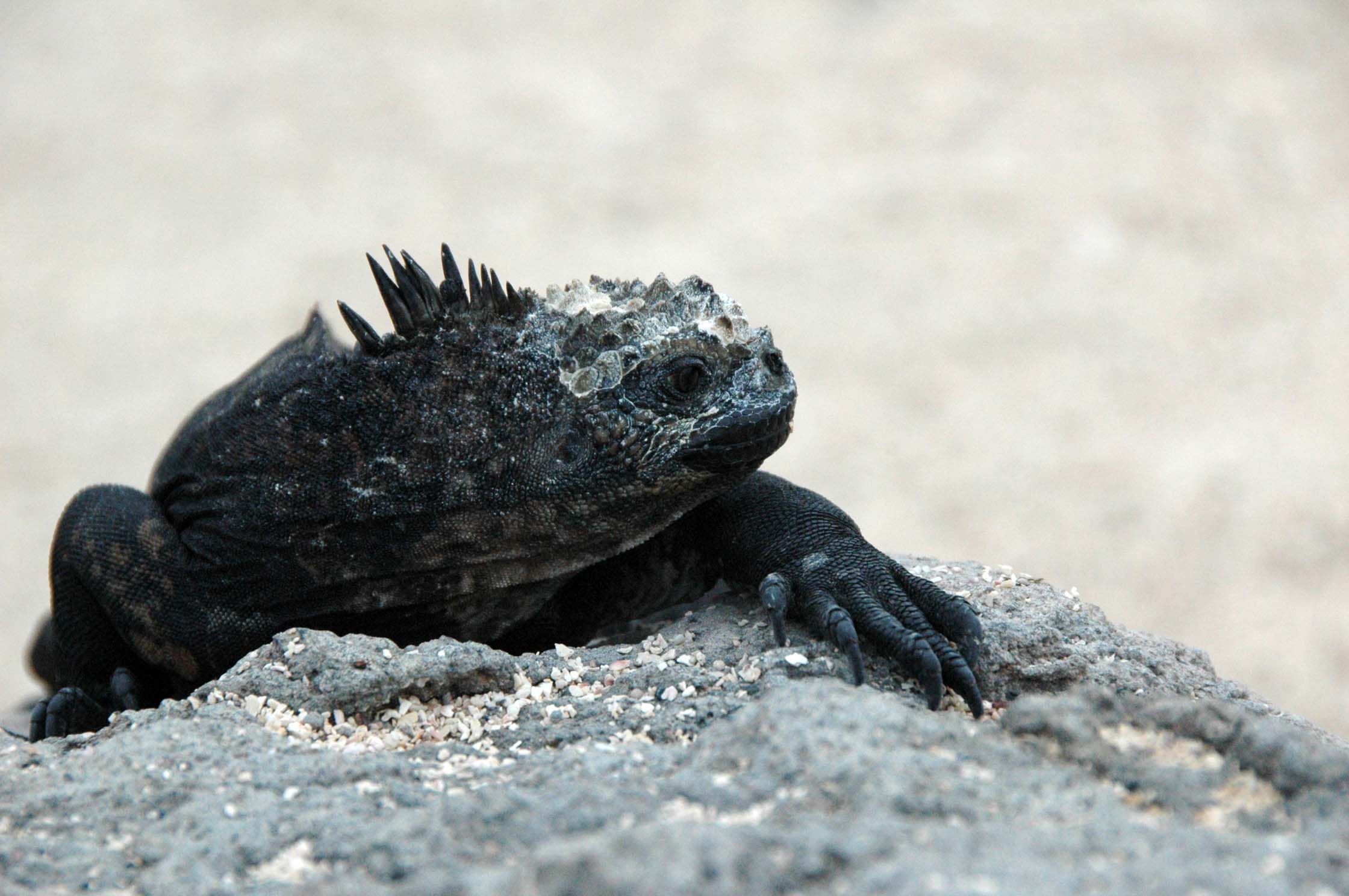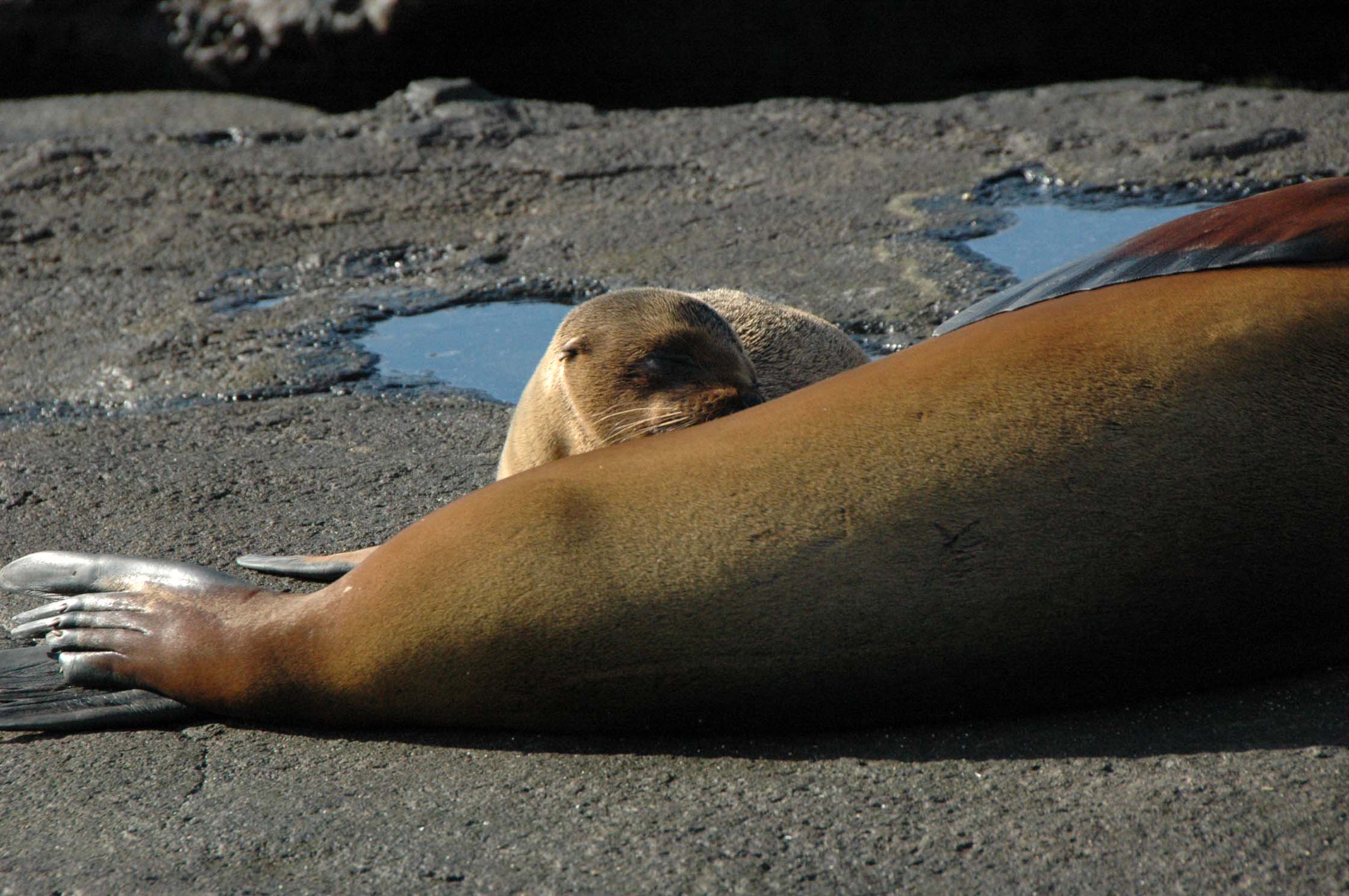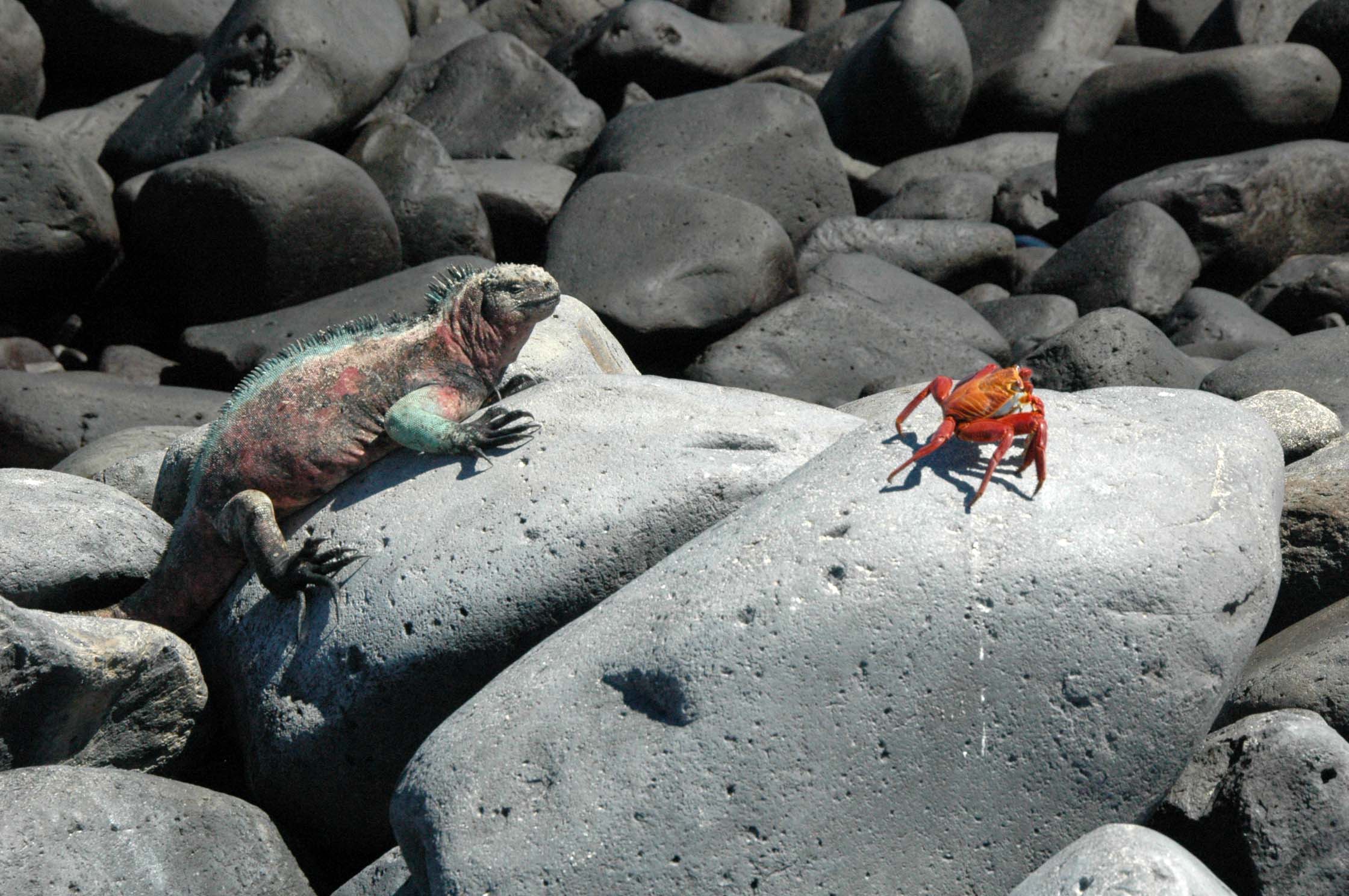 After lunch back on board, we had one last outing. We zodiaked to a black beach (wet landing) at Puerto Egas on the western shore of Santiago Island. We again snorkled although visibility was not very good. We were about to get out when we saw a turtle. He (she) was right under me and I swam with him for about 15 minutes just watching him munch on the sea weed, swim/float around, come up for air now and then. It was amazing. Then it was off for a walk around the tide pools. The sun was low in the sky and reflected off the water, off the backs of the sea lions and was generally gorgeous. The animals were all very active with sea lion pups frolicking in the tide pools, marine iguanas chasing females to try to mate or chasing off other intruding males. We saw an American oystercatcher sitting on her two eggs. We saw fur seals (who are really sea lions – there are NO seals in the Galapagos). We saw crabs every where. And a yellow warbler, a yellow-crested night heron, a rudy finch, a fly-catcher finch, a lava lizard and other birds I can’t name.