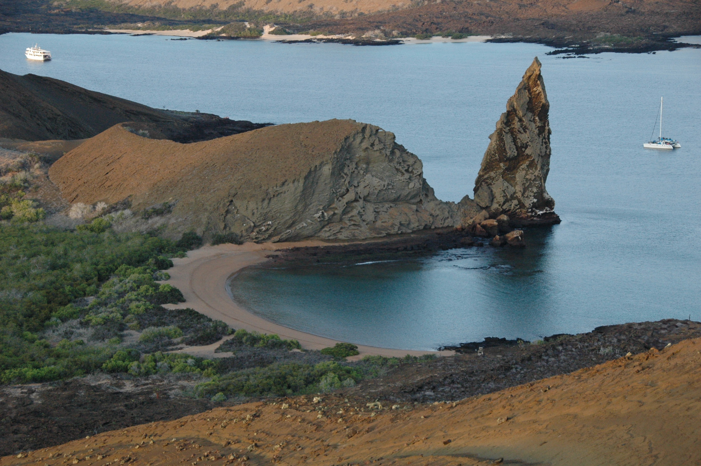 Today is our last day in the Galapagos. The day started with a 6:00am departure for a pre-breakfast landing on Bartolome. Bartolome is in the central part of the archipelago and is a lovely volcanic islet just off the east coast of Santiago Island and in the shadow of Santa Cruz. The conditions are rather dry (drought) so few plants grow here. It looks much like a moonscape of rust-colored cones and black lava flows and canals. We had a dry landing and climbed 372 steps (yes, they built wooden steps to the top) which took us 359 feet up to see the spectacular 360 degree view. We looked down at the golden beaches (which we would visit later in the morning) and at pinnacle rock where Master and Commander was filmed.